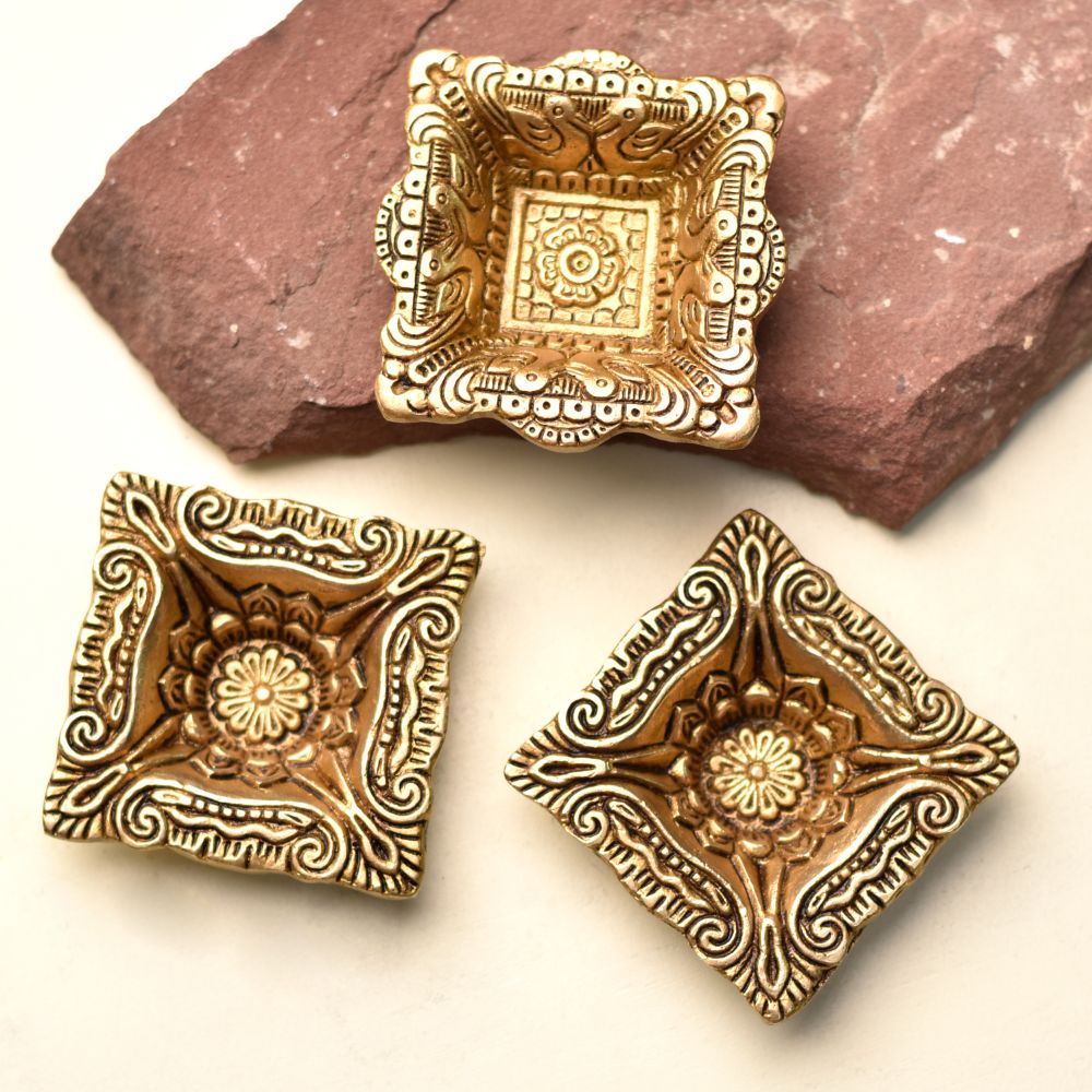 Celebrate the festival of lights with this Brass Carved Square Shaped Oil Lamp, a diya that blends tradition with artistry. Handcrafted in solid brass with a golden polished finish, it features detailed carvings in a square form, symbolizing balance, stability, and prosperity. Perfect for Diwali décor, temple rituals, or as an auspicious gift, this diya adds a sacred glow to every celebration.