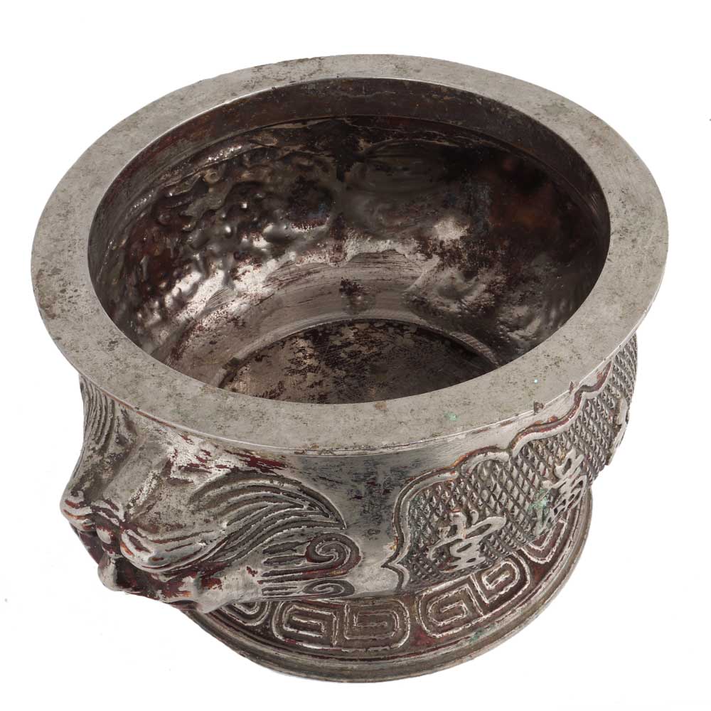 Brass Chinese Planter Engraved Lion Head And Chinese Inscription made for decoration and gifting etc with silver polish , it has fine engravings all over the pot with Chinese dragon as handles. Diwali gift, new year gift, wedding gift, indoor decoration of home , office and other social and corporate interiors.