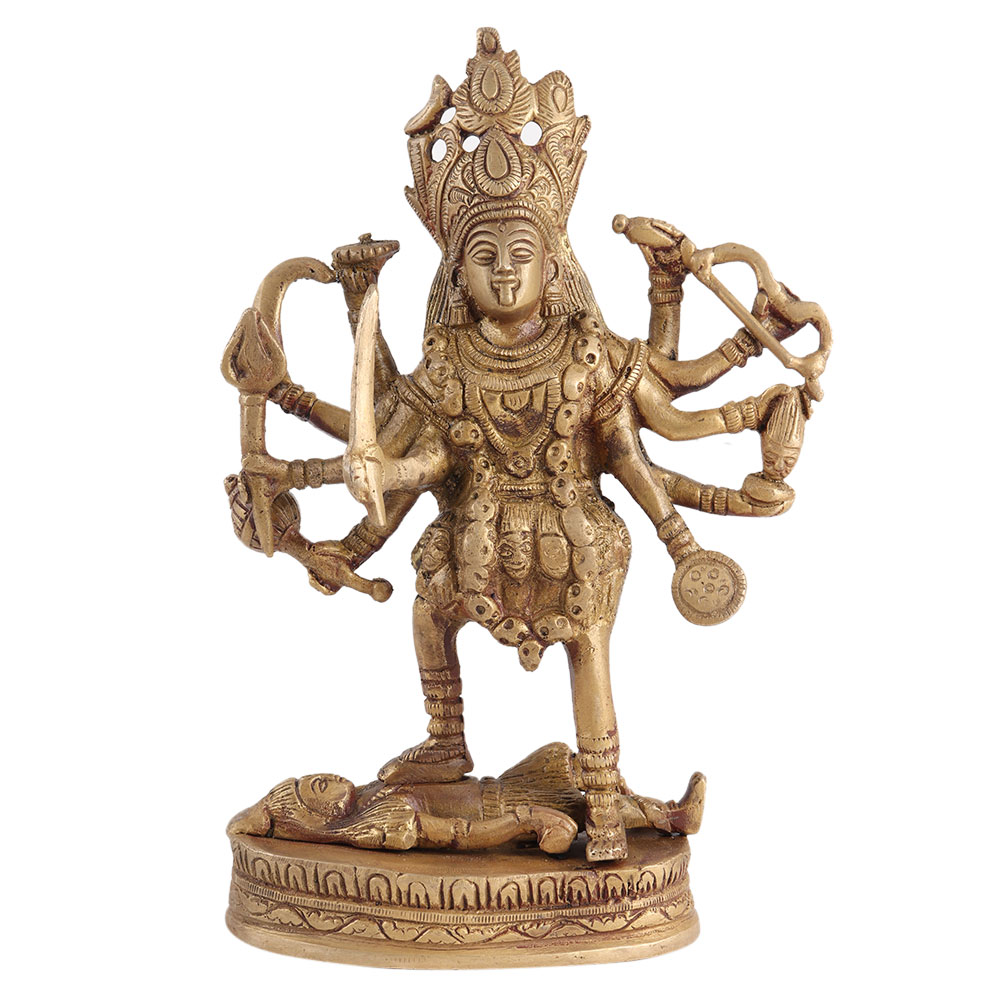 Hindus believe that his powers of destruction and recreation are still used today to destroy the world's illusions and imperfections, opening the way for beneficial change. Handmade Goddess Kali Handmade Brass Statue  with a golden finish is an ideal Spiritual Lucky Gift, Fengshui Gift, Thanksgiving Gift, Anniversary Gift, Birthday Present, Wedding Present, Diwali Gift, Durga Pooja Gift, Dussehra Gift.