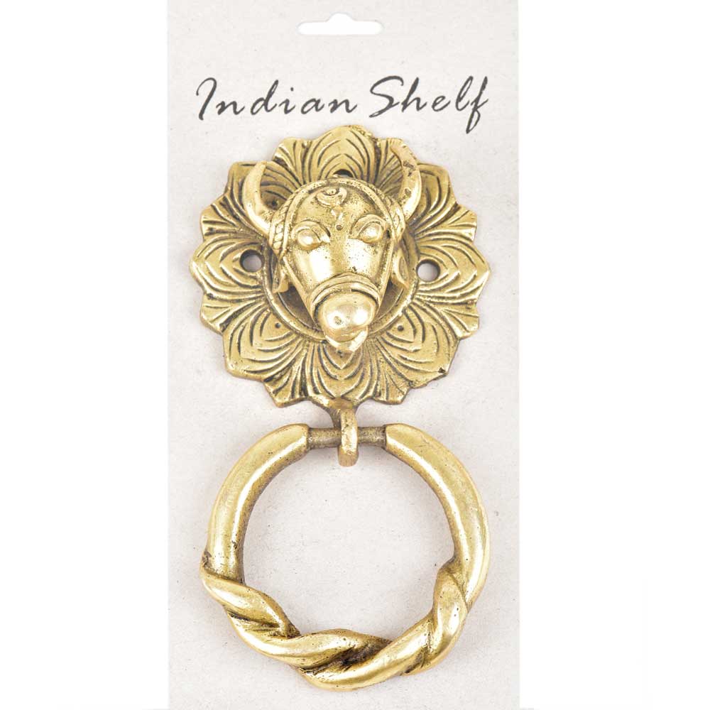 Exclusive handcrafted brass door knocker for the main door with cow head on the top of the knocker with a brass ring attached it. The beauty of ths knocker is that it can also be used as a towel ring. A lovely home decor product.