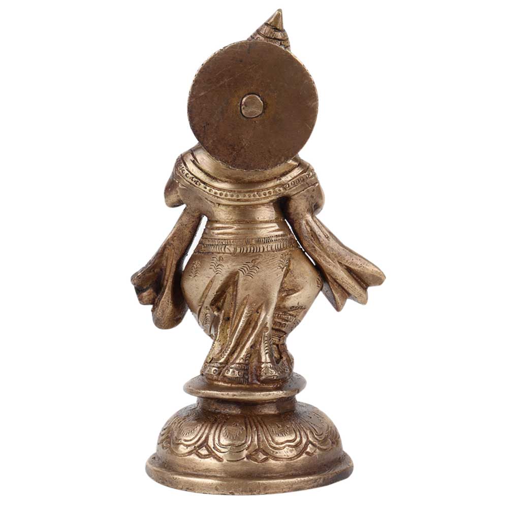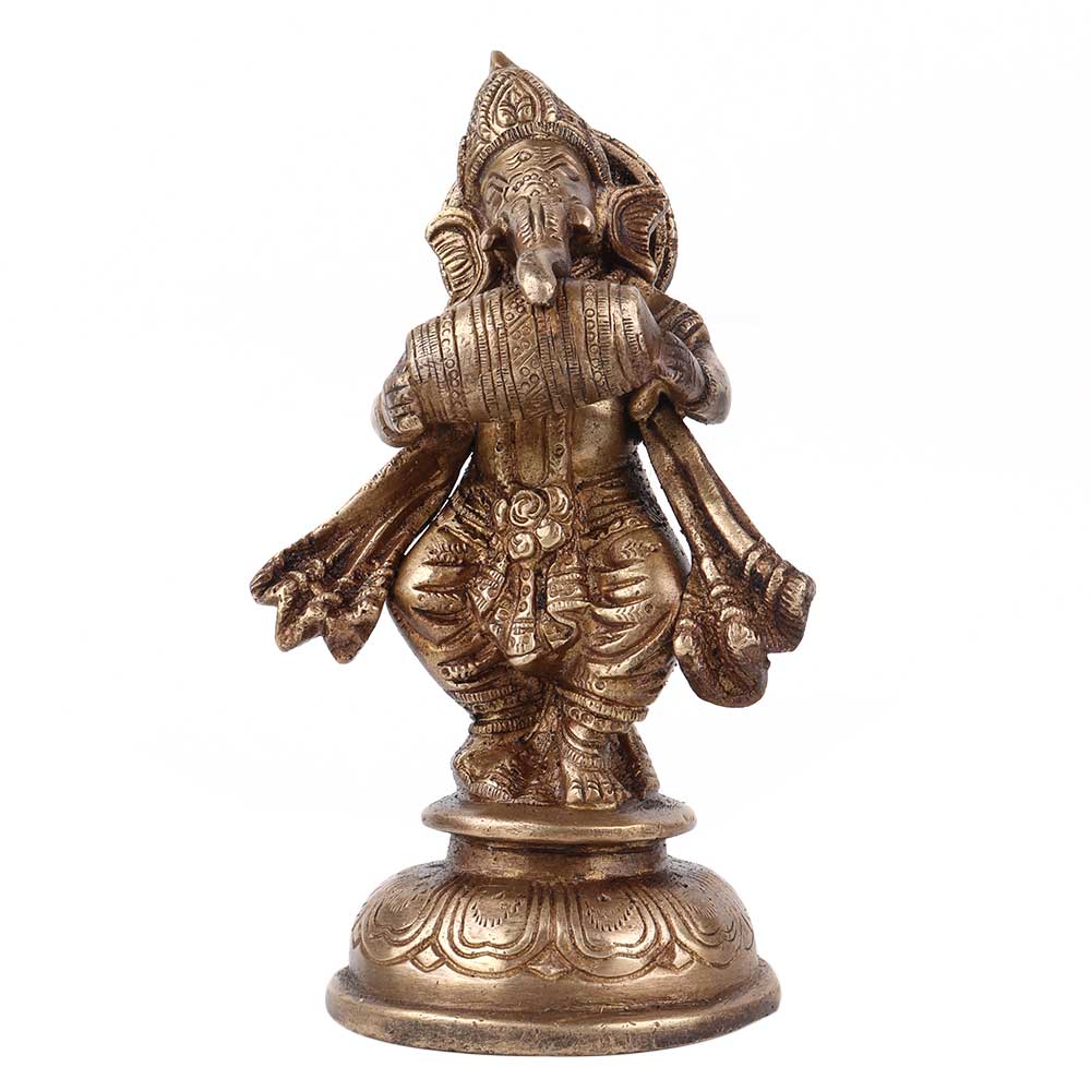 Hand crafted Brass Ganesha Statue is shown dancing and playing a drum. He is standing on a circular base and often depicted playing music. He is also the remover of obstacles and is worshipped before any new beginning of new venture.