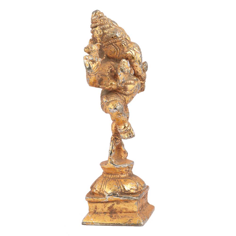 Brass Dancing Ganesha Statue In Golden Finish on one foot and the other rests on a lotus base . It can be used for worshipping, decoration .Diwali gift, wedding decoration, stage decoration and showpiece for your home interiors.