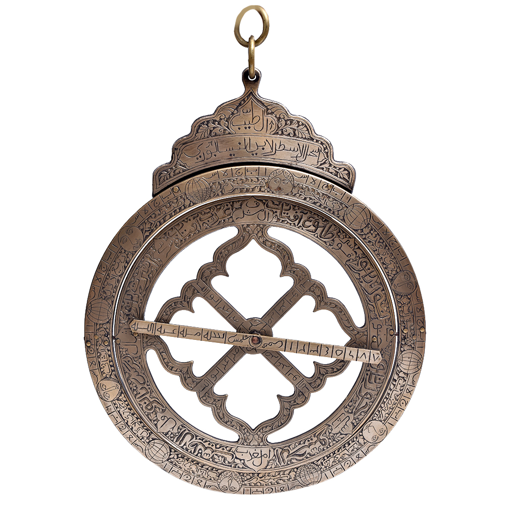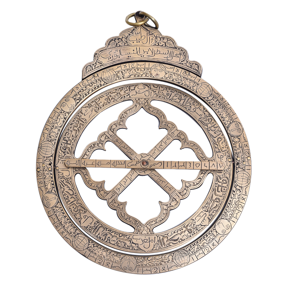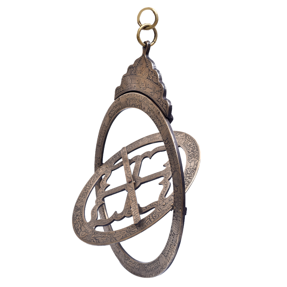 Brass ring dial from the mid - eighteenth century. This horological device was created by one of his generation's greatest designers and manufacturers. The dial is made up of two rings, with the outer ring containing a bridging bar. The outer ring, which depicts a circle encompassing the North and South celestial poles, is known as the meridian ring. Islamic carvings are carved into the rotating bridging bar. Between the bridge's bars is a slider with a pinhole that serves as the shadow mark. Nice décor item that is ideal for gifts.