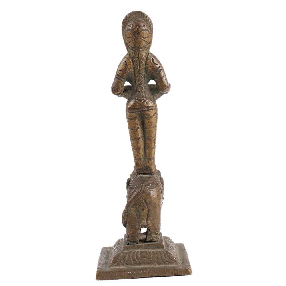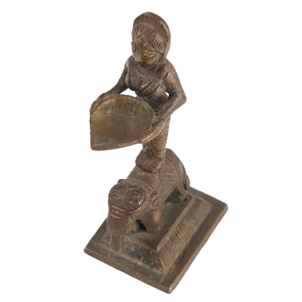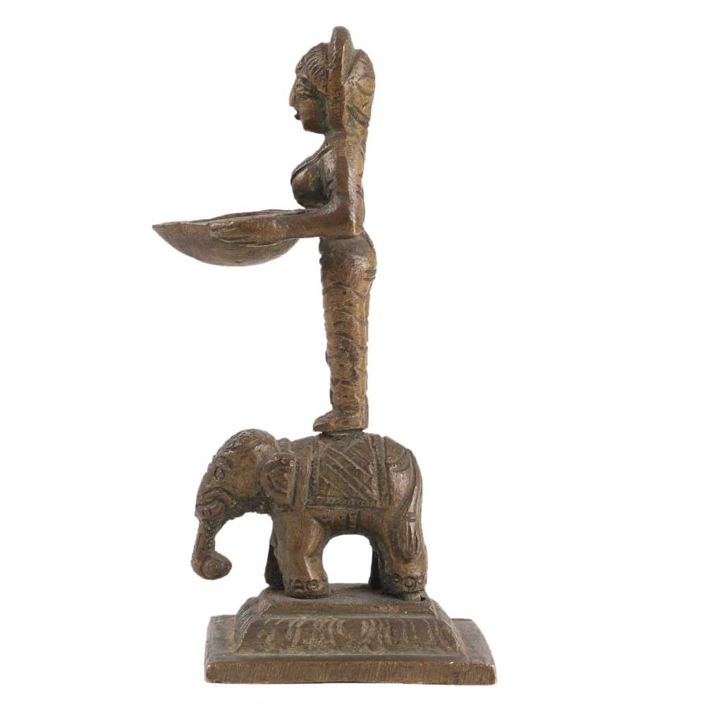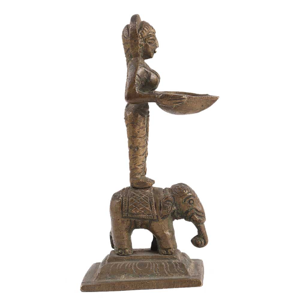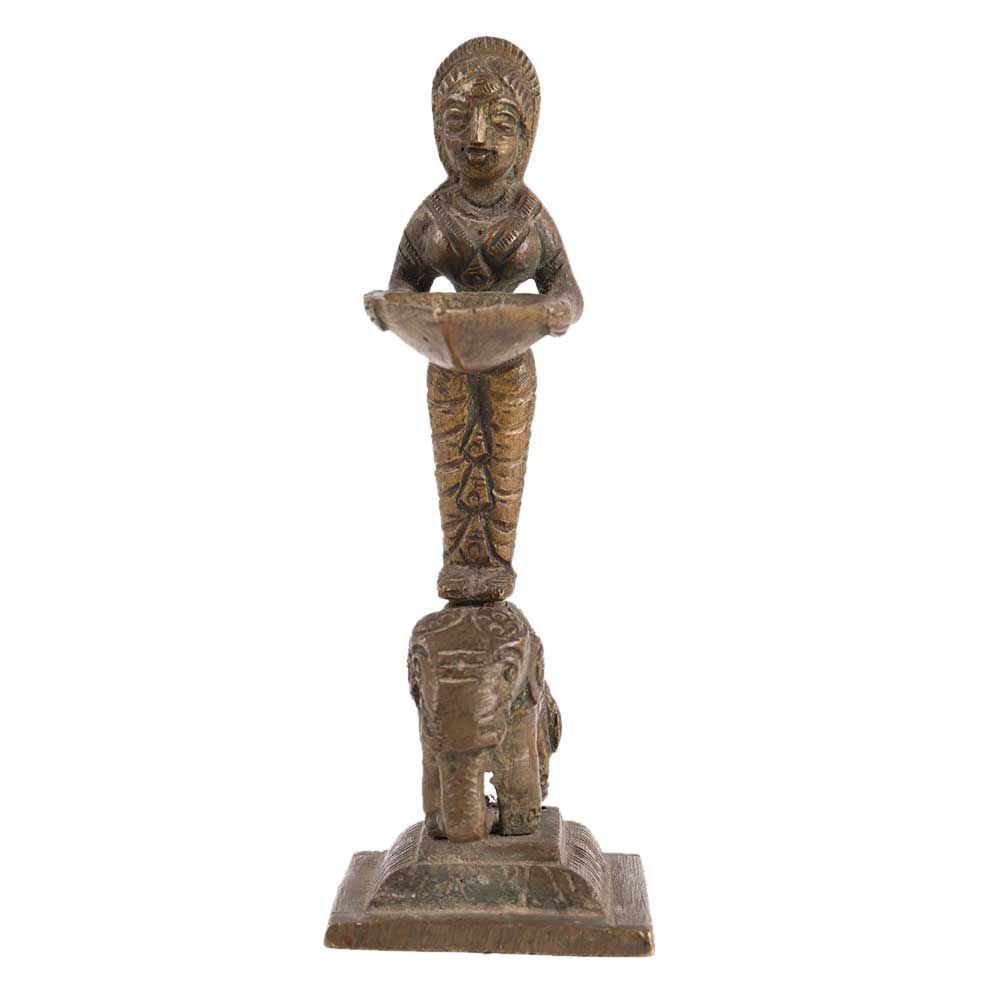 A lovely handcrafted brass Deep Laxmi oil lamp from Southern India. Laxmi is the hindu deity of material wealth, and this lovely little oil lamp would have been lit during puja celebrations in the temple.