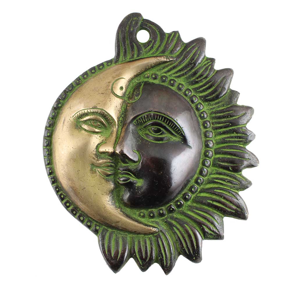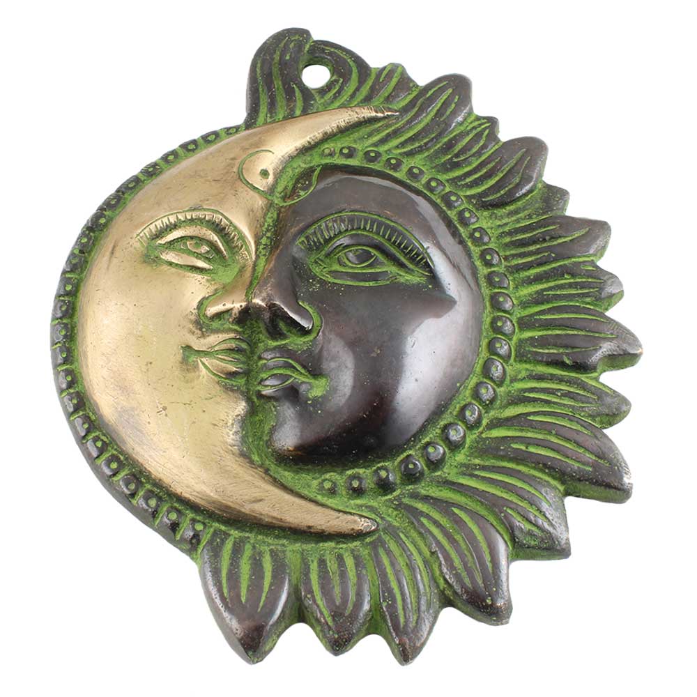 Brass Designer Sun Moon Wall Art with A Creative Touch. It can Also be use as Wall Hanging and Displayed on the Walls of Your Living Room or in the Corridor . the Sun and Moon Face is Joined Together in Two Halves to Create This Decorative Wall Hanger and Hook.It comes with an aged patina.