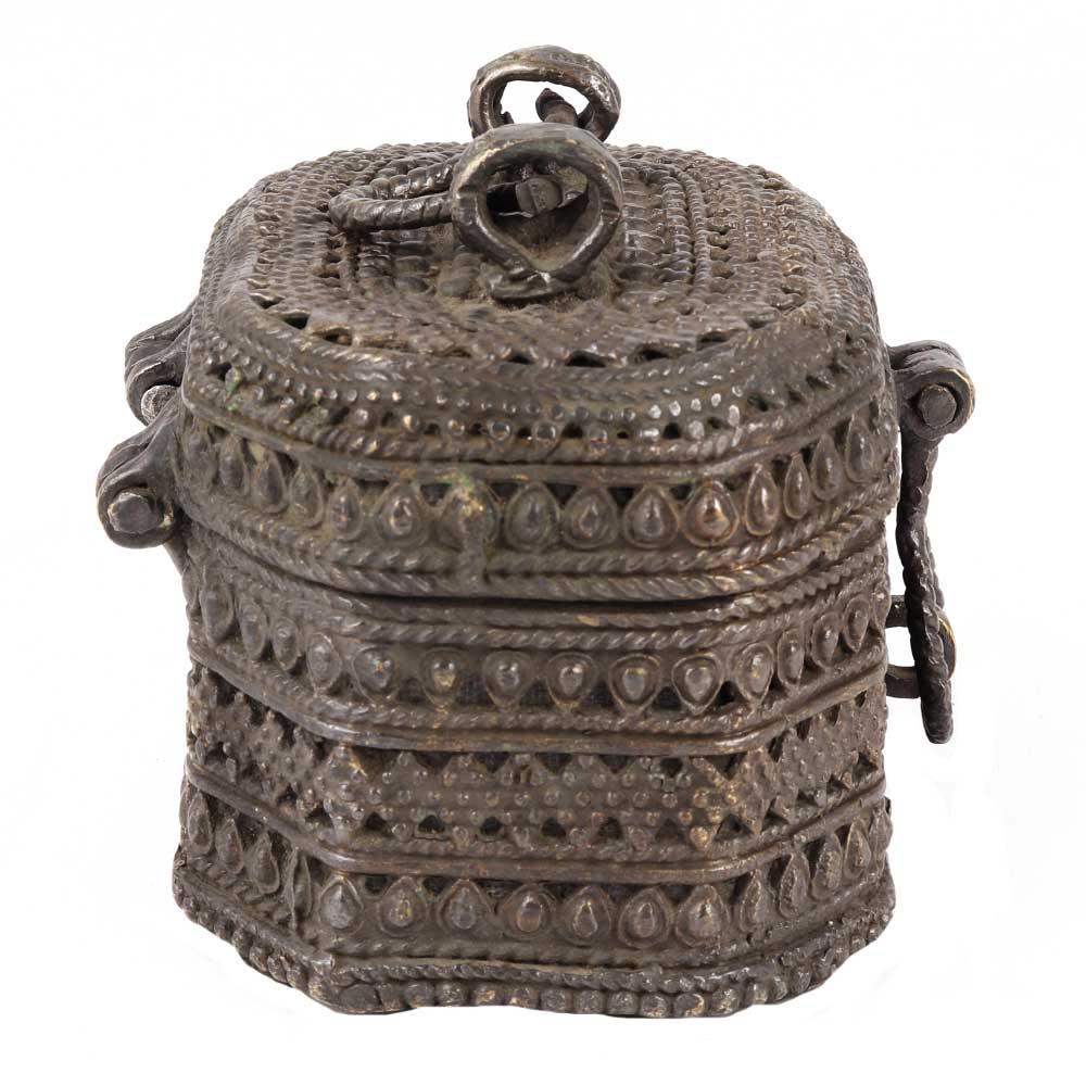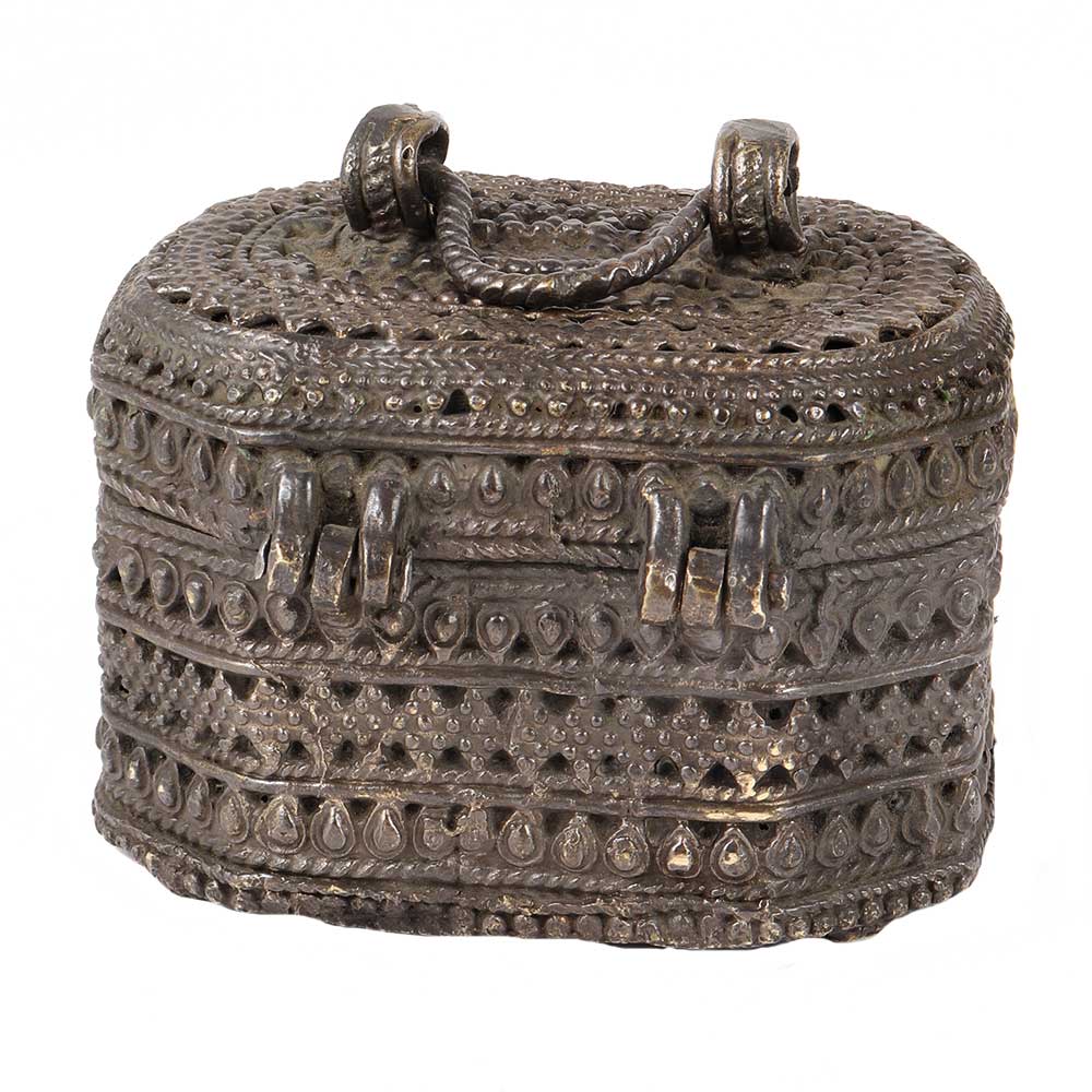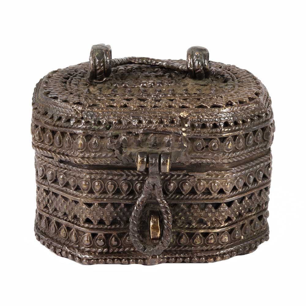 Traditional handcrafted brass tribal storage box with finely carved design on the surface is ideal for storing tiny items of jewellery such as earrings, necklaces, rings, and so on. It also makes an excellent gift for friends and family.