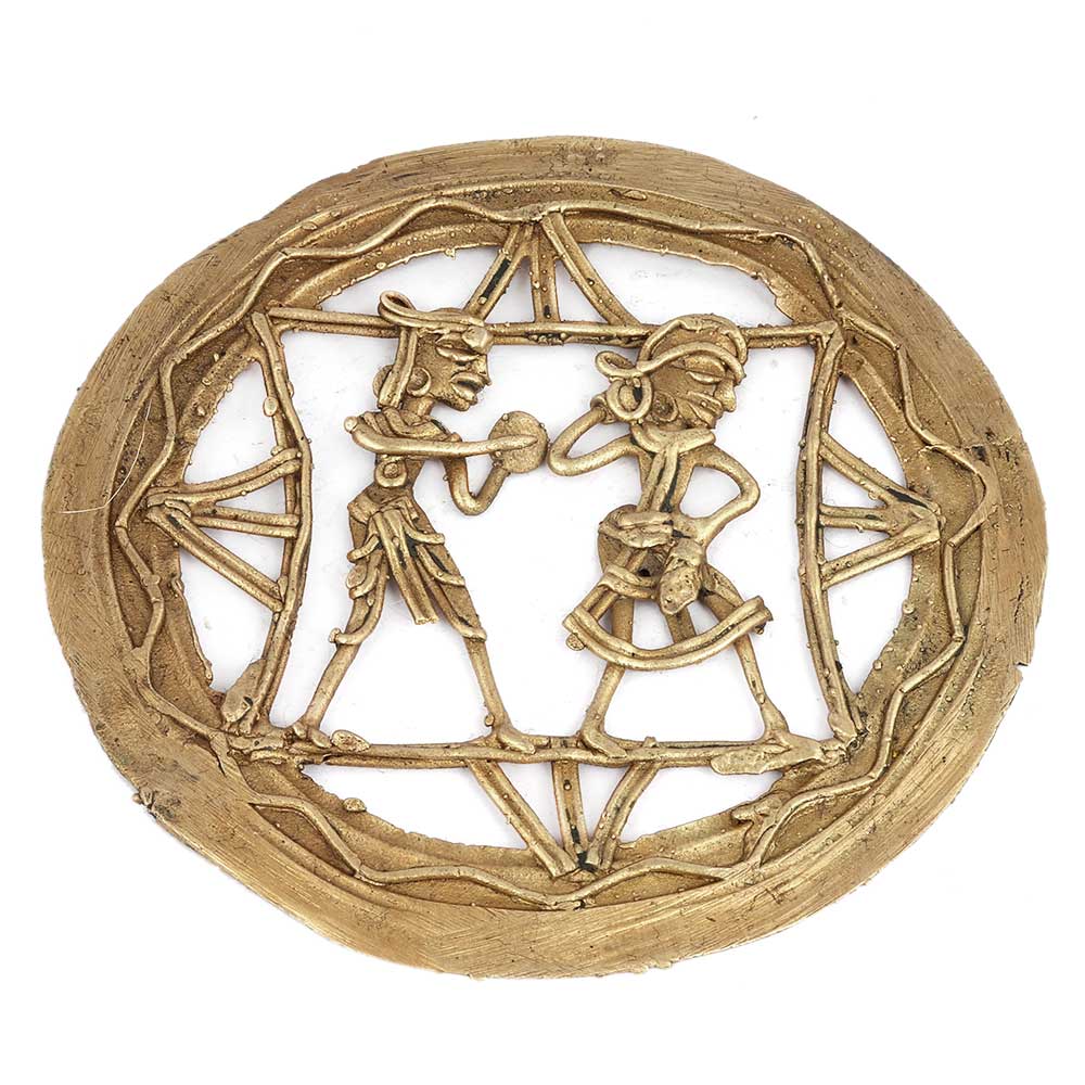 Brass Dhokra Working Couple Wall Hanging Plaque with intricate lattice ornamentation and intricate design with a round frame. framed or simply mounted on the wall or just placed on the table against the wall. Wedding gift, anniversary gift, house warming gift for your friends and family.