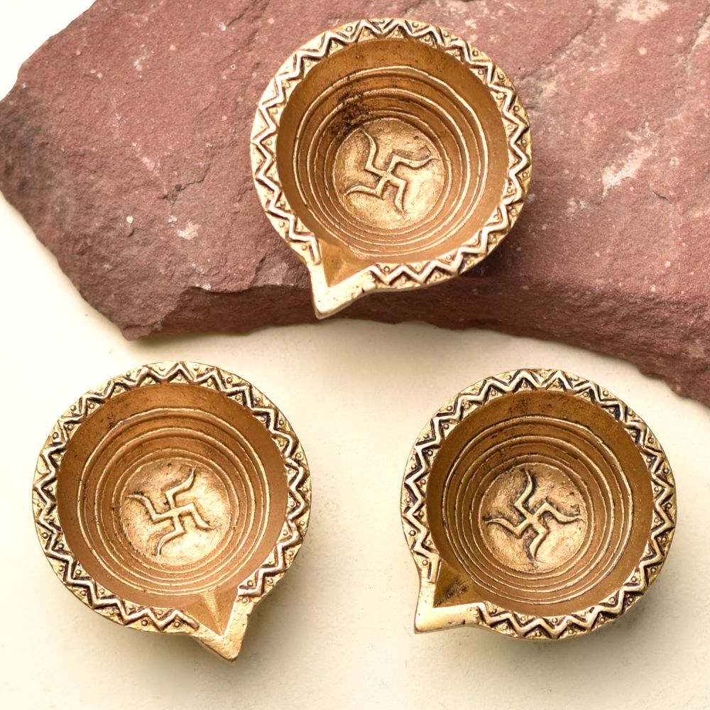 Light up your sacred spaces with this Brass Diwali Diya featuring a Swastika design, symbolizing prosperity, positivity, and divine blessings. Handcrafted in solid brass with a polished golden finish, this oil lamp adds both elegance and auspicious energy to rituals, mandir décor, and festive celebrations. Compact yet meaningful, it is perfect for Diwali and other cultural occasions.