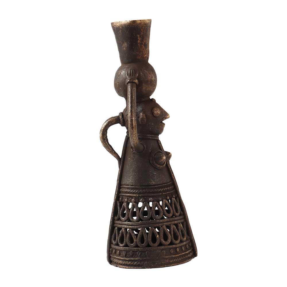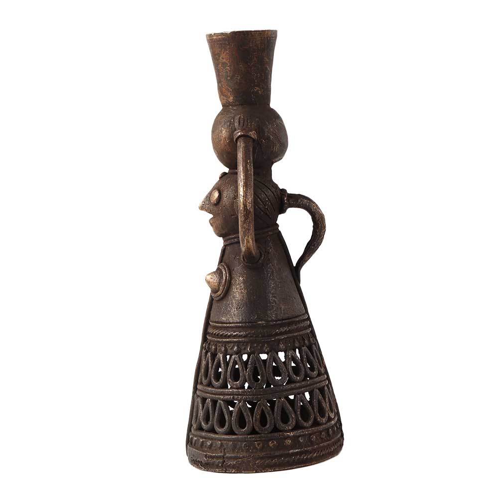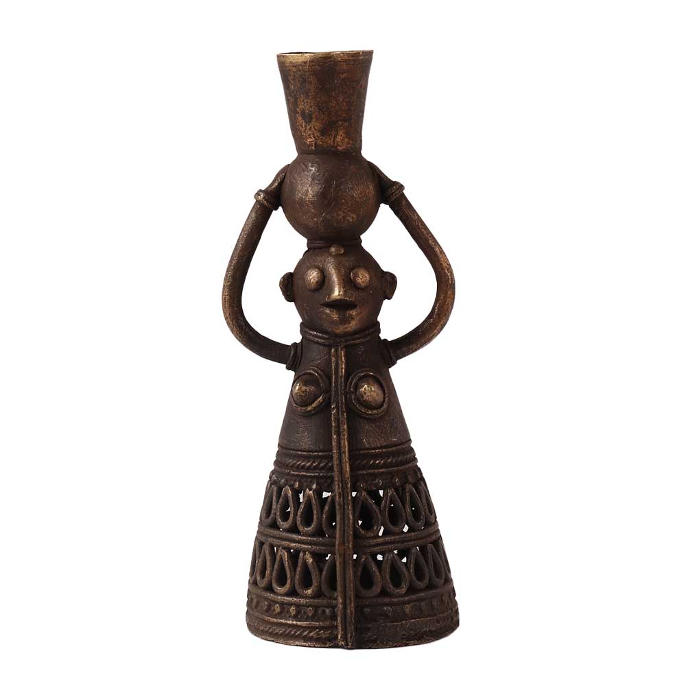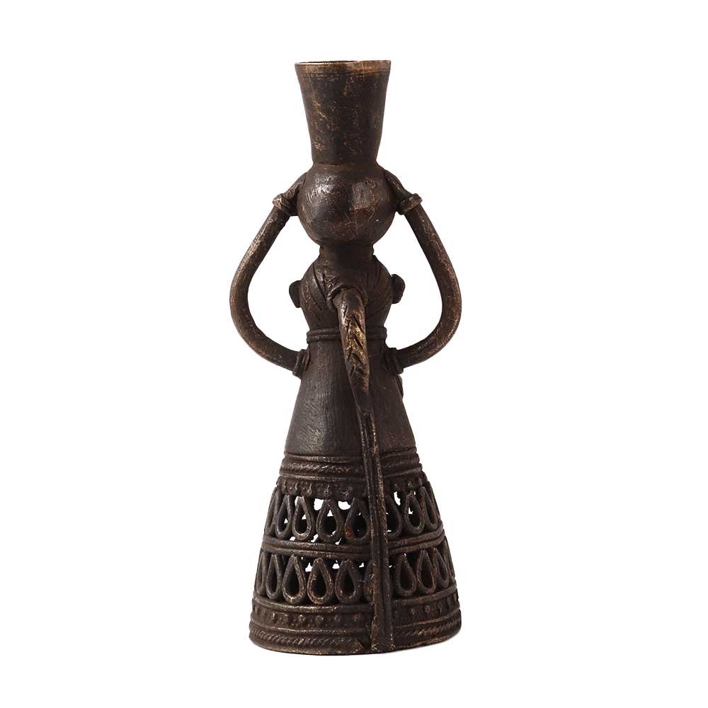 A sophisticated design of a brass metal alloy candle holder. This brass candle stand is in the shape of a doll holding a stand on its head with two hands. Place this embellished candle holder on your dining table, study desk, shelf, reception or altar to add aesthetic flair to your interior. Excellent addition with Jali work for decoration, vintage art collection or gifting on special occasions like anniversary, wedding, birthday, Thanksgiving, housewarming and festive occasions like Deepavali or Christmas to your family, friends or relatives.
