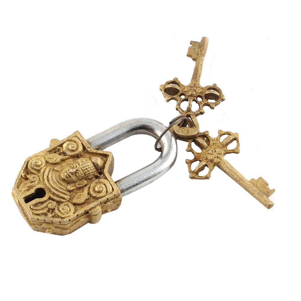Brass Door Padlock Buddha Head Sculpture With keys in pair is made of brass metal has great ornamental and beautification value. It enhances the decor value of the house, office, hotel, etc. Can be gifted on weddings, anniversaries, house warming ceremonies, new venture.