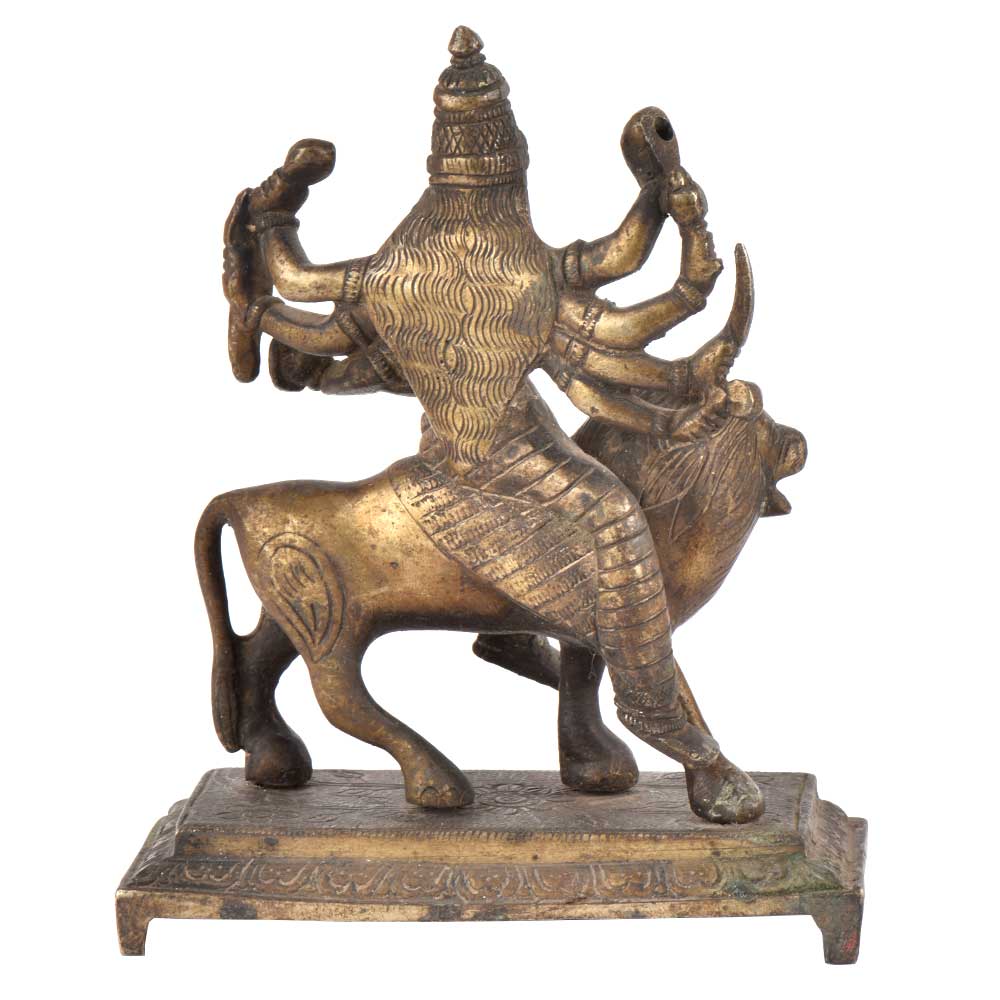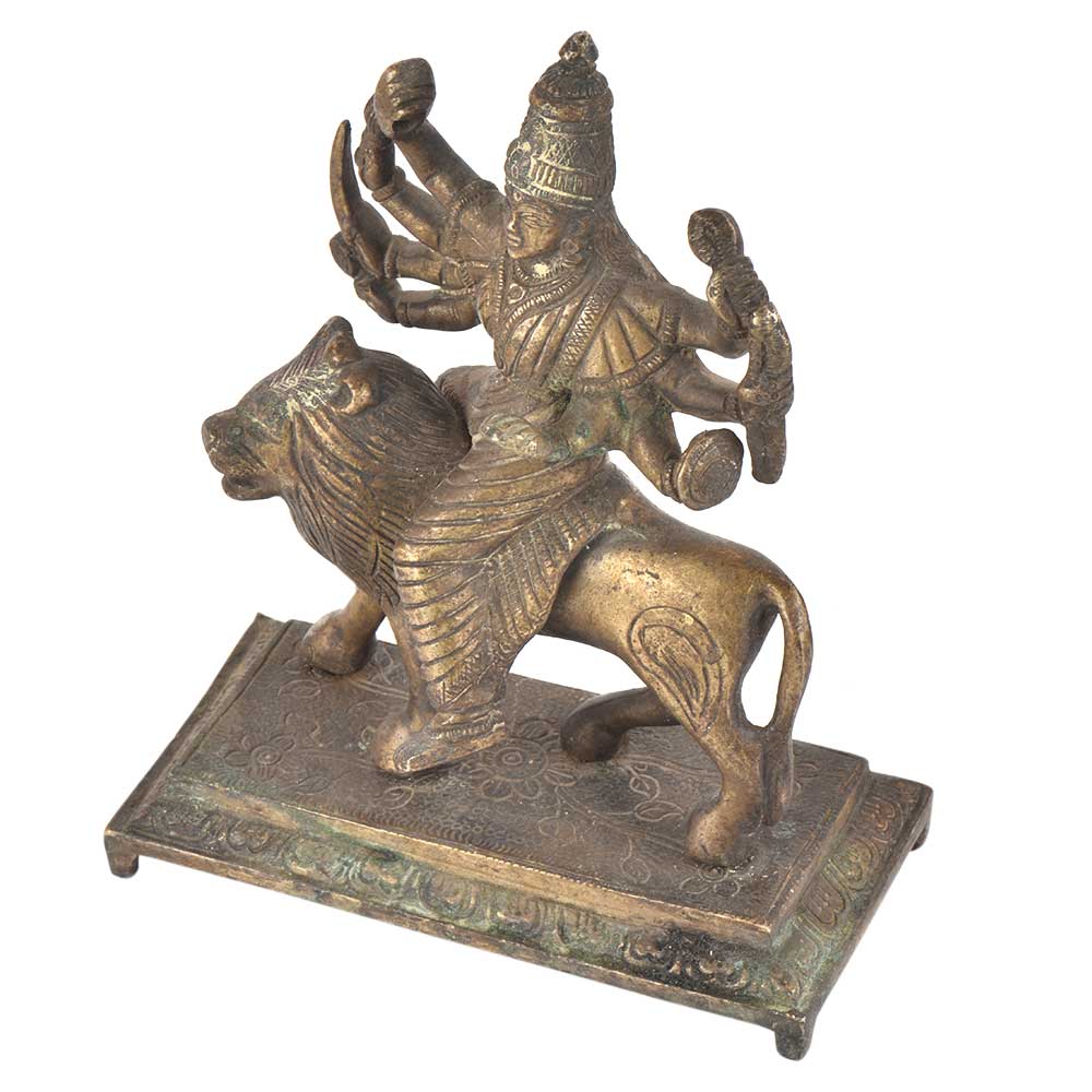 Durga is a Form of Devi, the Supremely Radiant Goddess, Depicted as Having Ten Arms, Riding a Lion or a Tiger, Carrying Weapons (Including a Lotus Flower), Maintaining a Meditative Smile, and Practicing Mudras, or Symbolic Hand Gestures. An Embodiment of Creative Feminine Force (Shakti), Durga Exists in a State of Svatantrya (Dependence on the Universe and Nothing/Nobody Else, Self-Sufficiency) and Fierce Compassion.