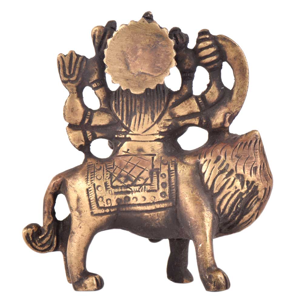 Durga is a form of Devi, the supremely radiant goddess, depicted as having eight arms, riding a lion , carrying weapons and a lotus flower, maintaining a meditative smile, and practicing mudras, or symbolic hand gestures. Ma Sherawali is finely depicted as sitting on a lion in a majestic manner.This brass sculpture of Hindu goddess Durga is meant for performing puja at home, or for simply decorating your home in Hindu way.