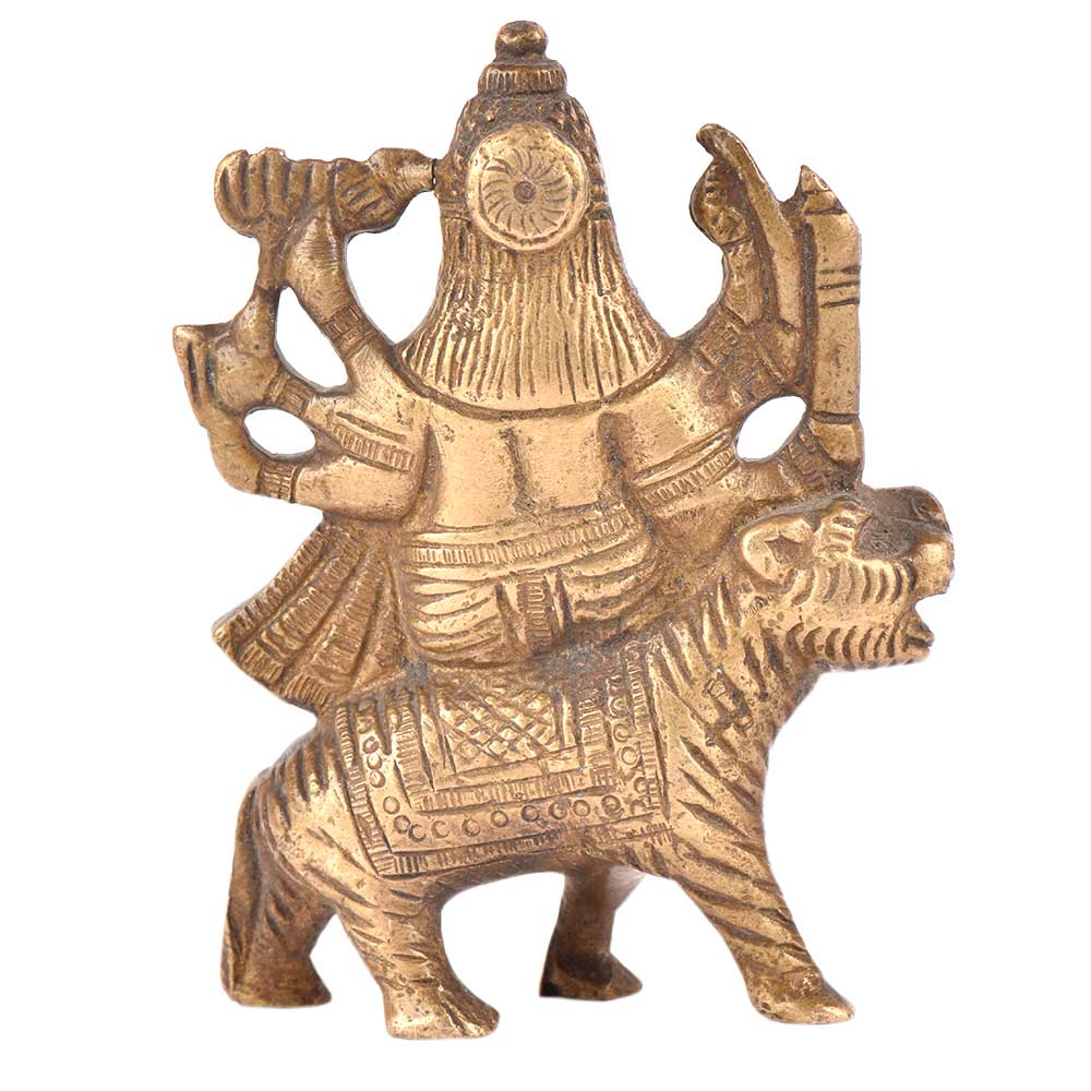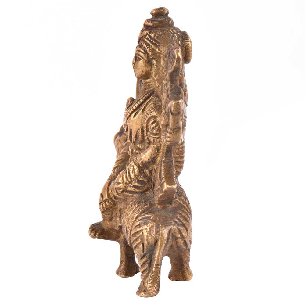 Durga is a form of Devi, the supremely radiant goddess, depicted as having eight arms, riding a lion , carrying weapons and a lotus flower, maintaining a meditative smile, and practicing mudras, or symbolic hand gestures. Ma Sherawali is finely depicted as sitting on a lion in a majestic manner.This brass sculpture of Hindu goddess Durga is meant for performing puja at home, or for simply decorating your home in Hindu way.
