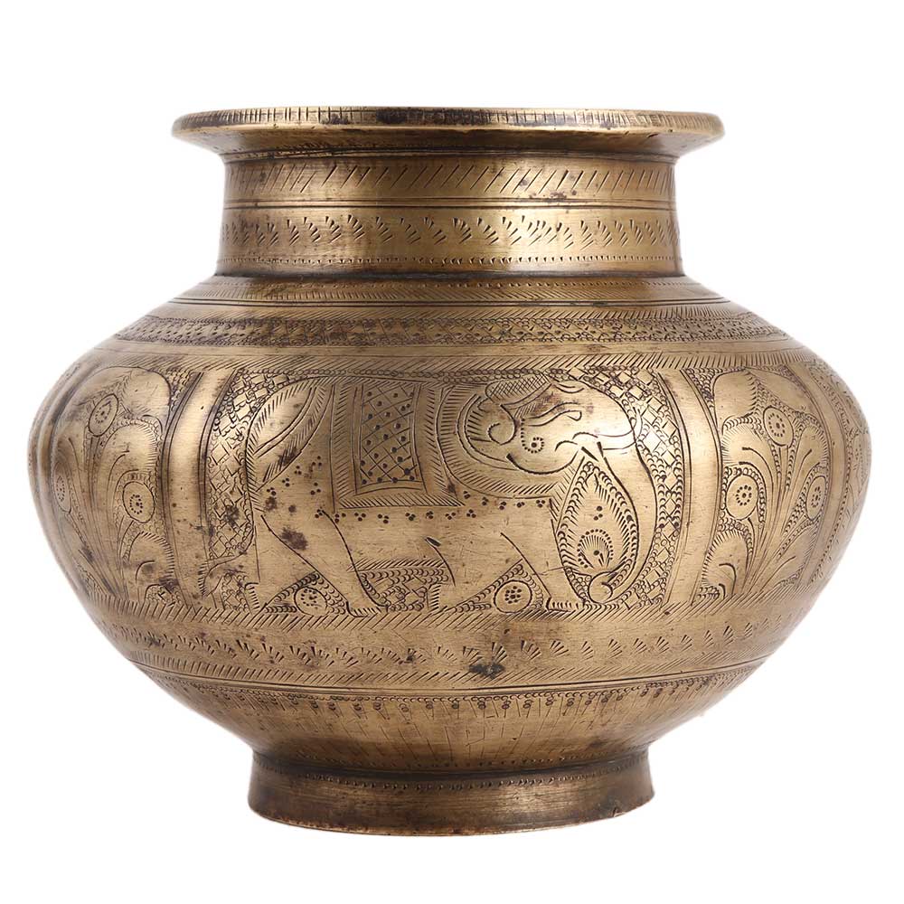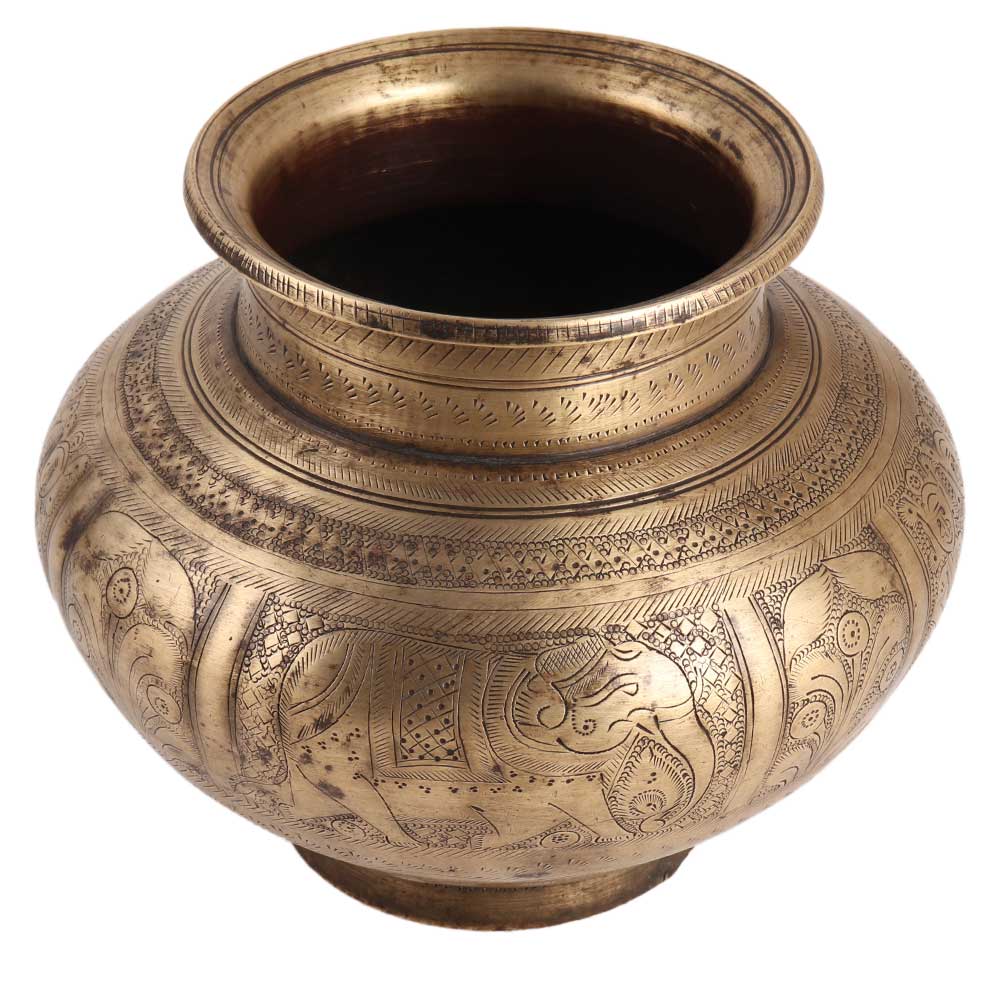 A unique and exquisite water pot with elephant and floral motifs engraved on the surface. Other designer elements such as diamonds, circles, and lines are also carved on it. There are also additional circular borders with different designs to complete the look. It is used to keep holy water in temples and other places of worship. Significant weight. A sturdy and solid piece. It can also be used as a vase. It also works well as a decoration.