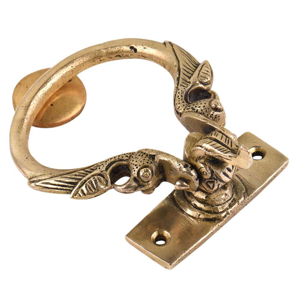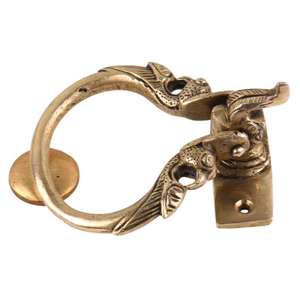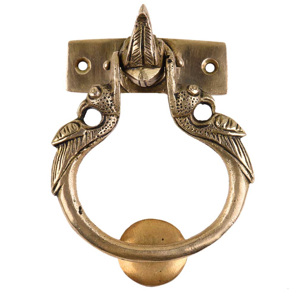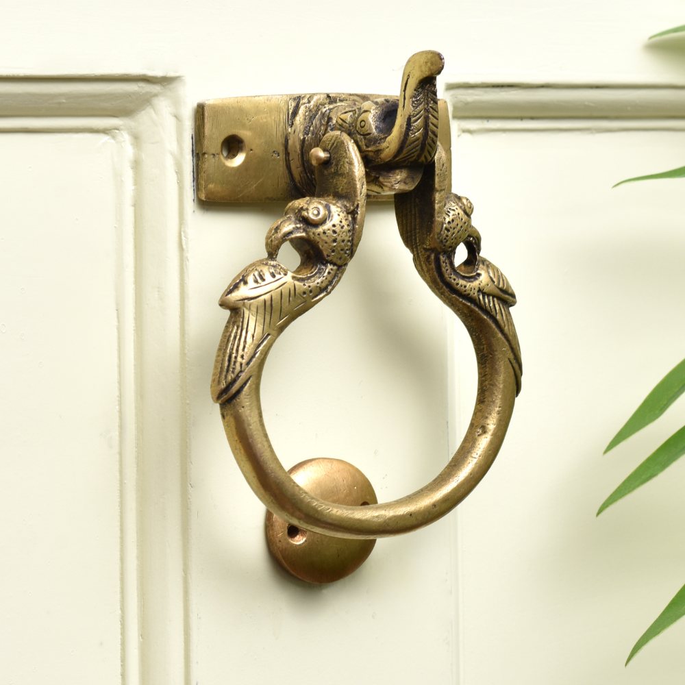 This brass door knocker is a traditional and elegant way to greet visitors to any home. This brass door knocker will age beautifully to become a lovely door adornment. This solid brass door knocker in the shape of an elephant head with peacock figurines on the ring will look lovely on the entrance door as well as other doors.