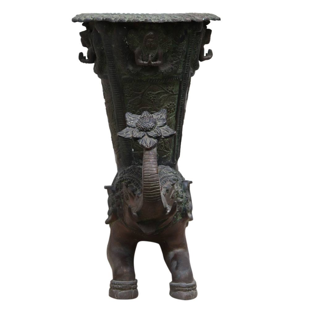 AÂ medium-sized Indian brass elephant from the 19th century that might have come from a temple. The artwork depicts an elephant with a vase on its back and a colourful robe covering its body. The vase contains floral designs, foliage motifs, and garlands on either side as design components. An excellent gift for friends and family.