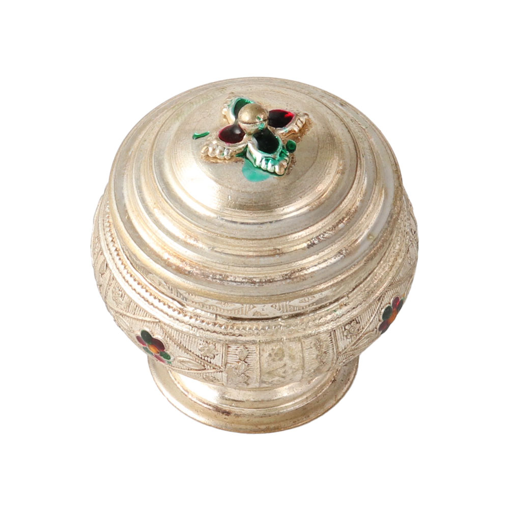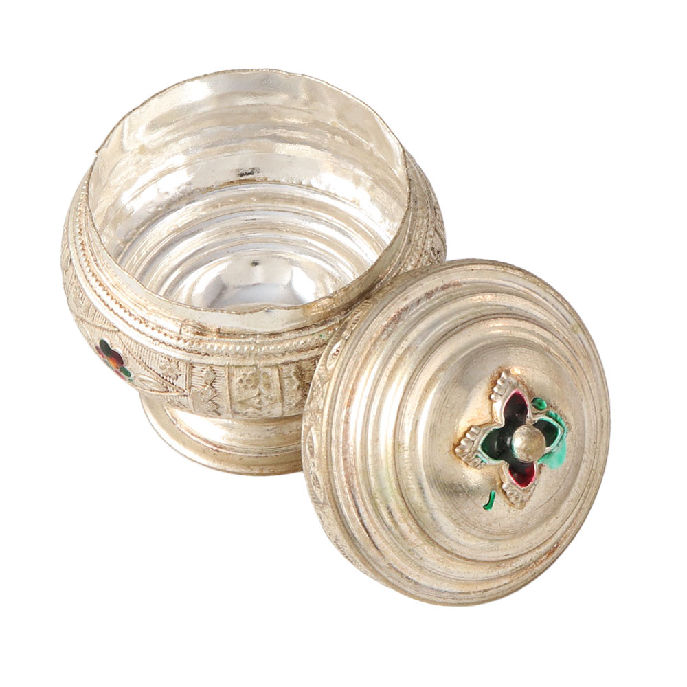 Brass kumkum box with removable lid perfect for gift-giving and home use. Box with a stand and internal self-design. Simple to open and shut. a must for the pooja room. You and your family's wellbeing will be enriched by the worship power of this Sindoor Dabbi. It is perfect for giving the blessing of pure silver metal to a new spouse or a newborn. It comes in a lovely silver finish.