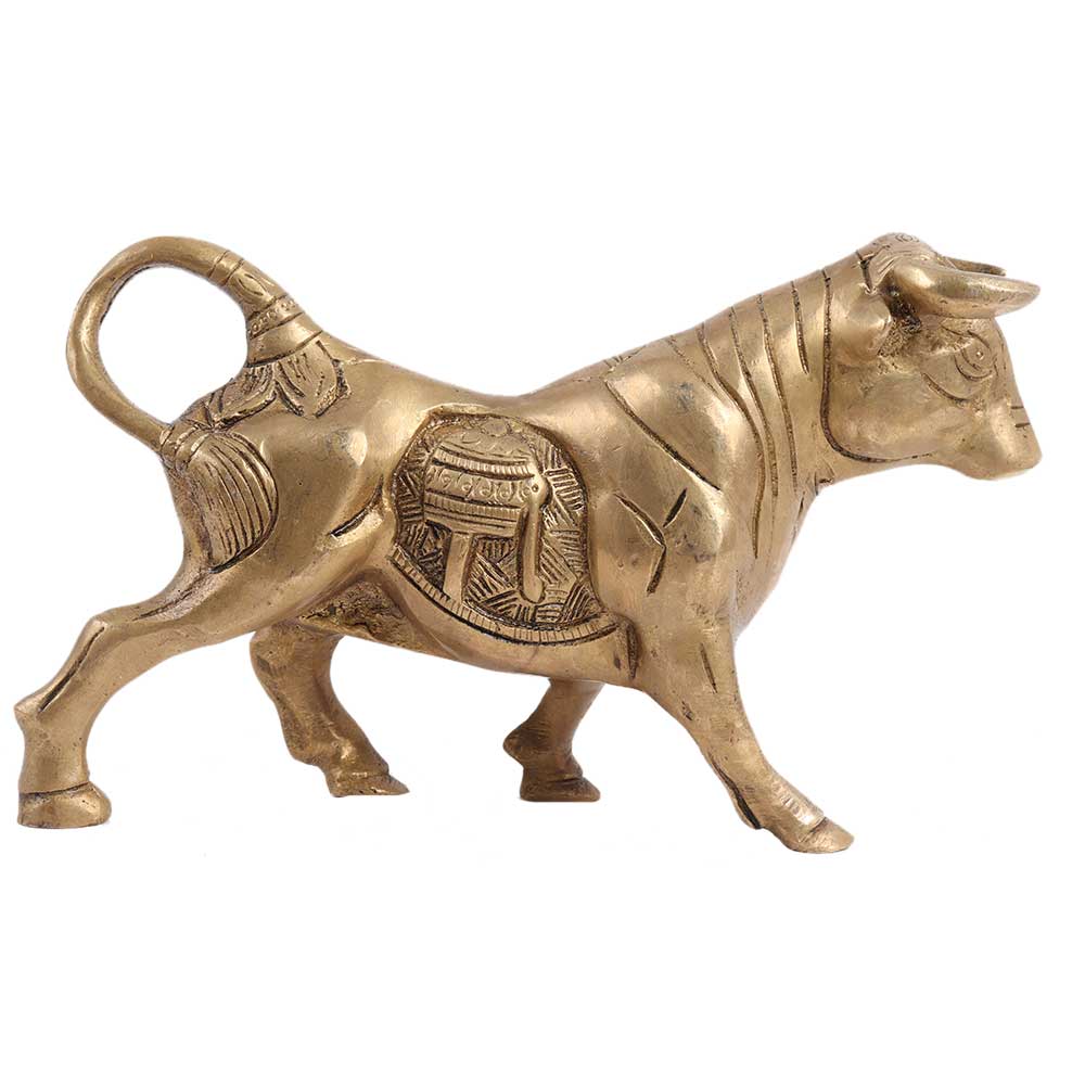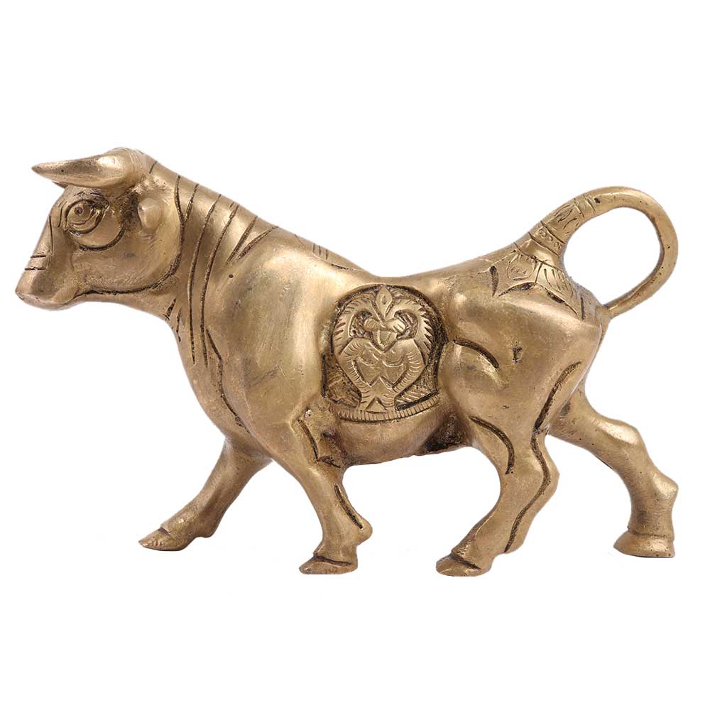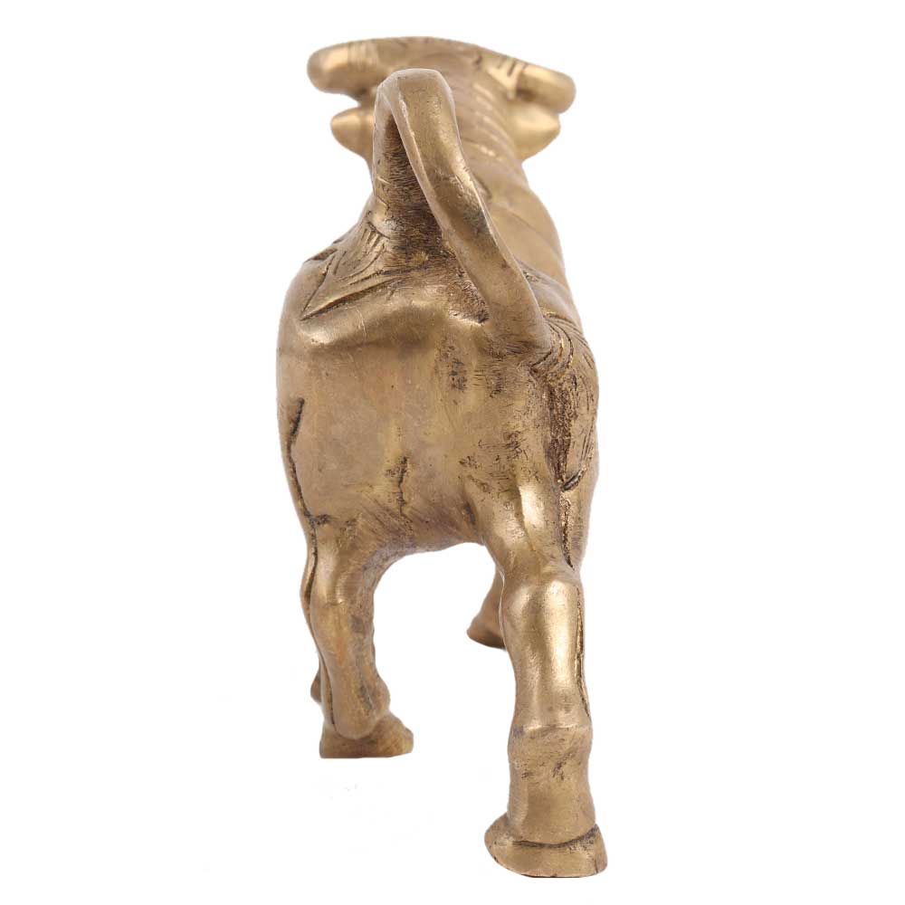 Bulls are known for their muscular endurance, with heavier bones, larger feet, a very heavily muscled neck, and a large, bony head with defensive ridges over the eyes. Here in this posture, it appears that the Bull is about to attack with its ferocious horns. This brass Bull will definitely liven up any mantelpiece. The exclusive old brass colour adds to its allure! Use it for all kinds of interior as well as exterior decoration.