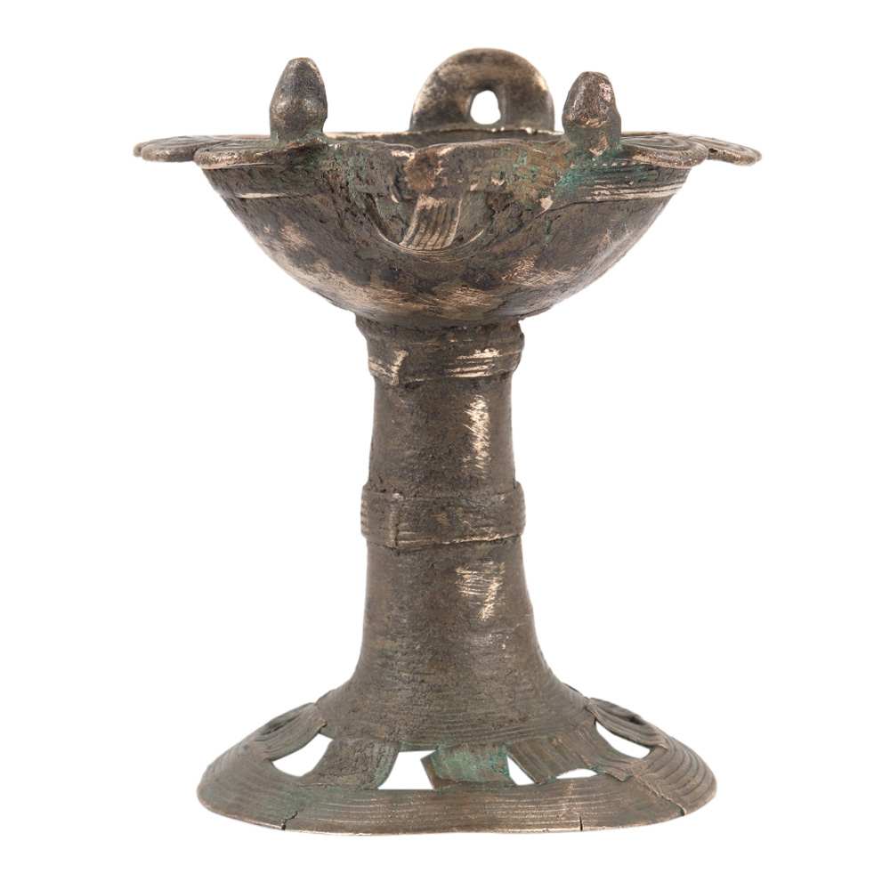 This lovely handmade brass diya has a distinctive fish shaped pattern with a stand can be used to enrich the atmosphere for celebrations such as Deepavali, Durga puja, and Karthikai Deepam. It comes with a dark finish.