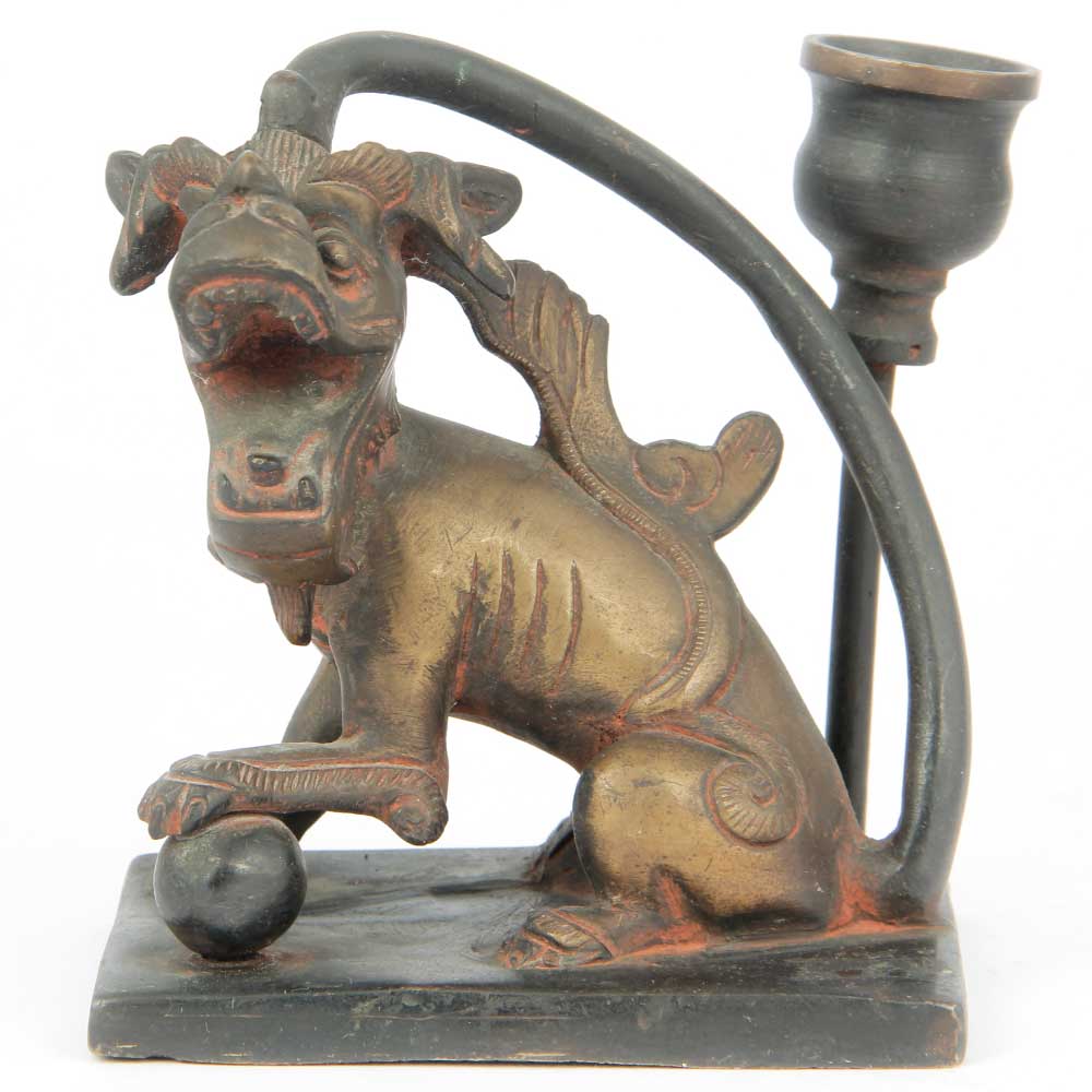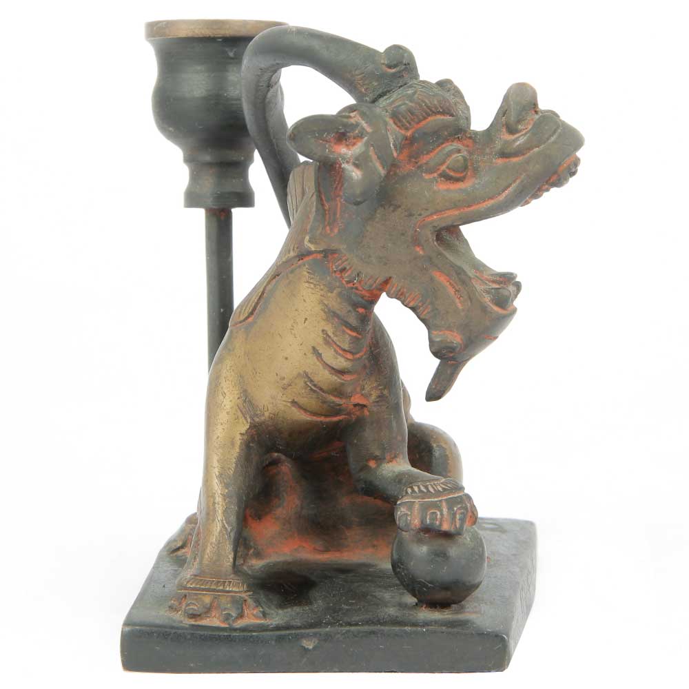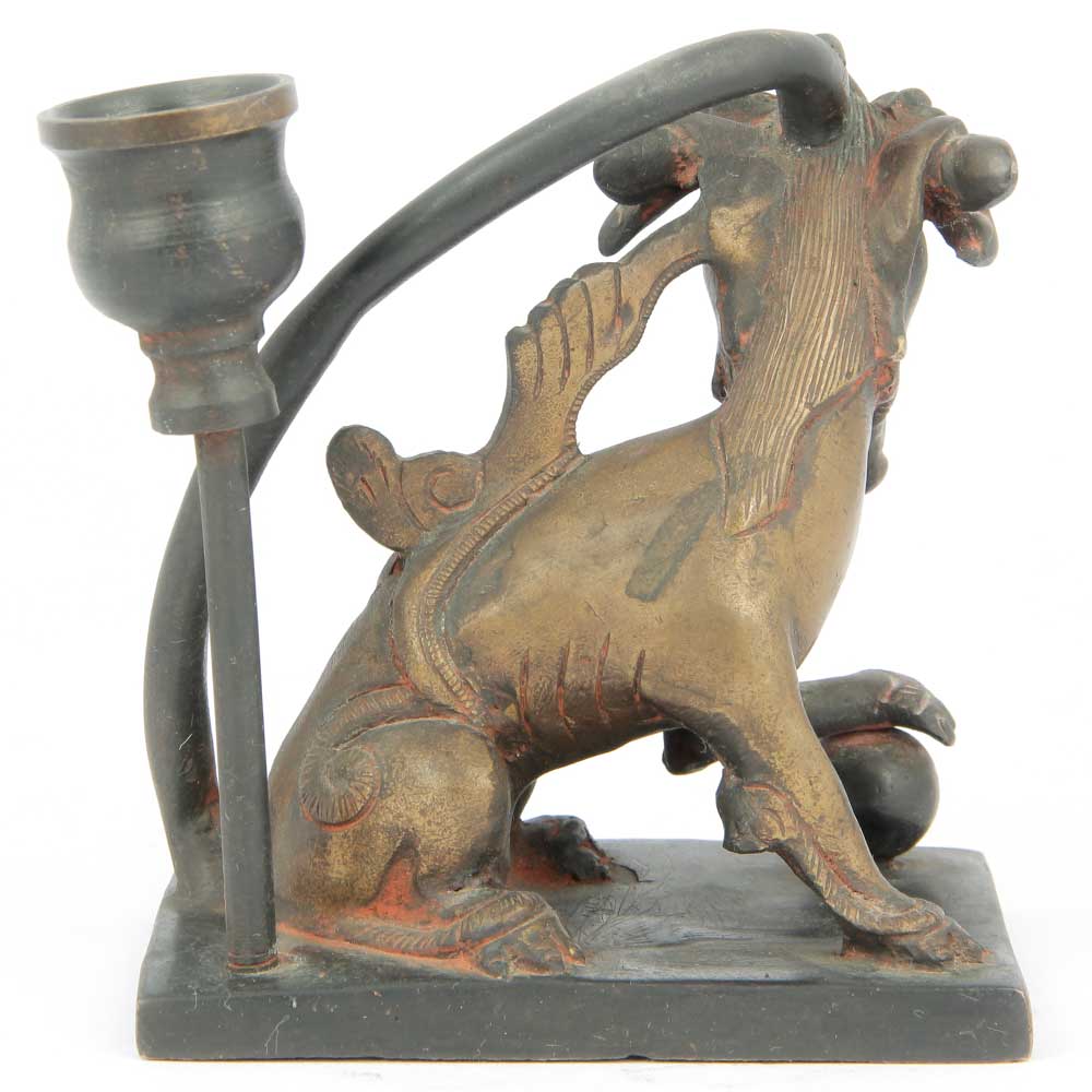Vintage Asian Oriental Dragon Lion Fu Foo Dog Figural Candle Holder Brass Art.