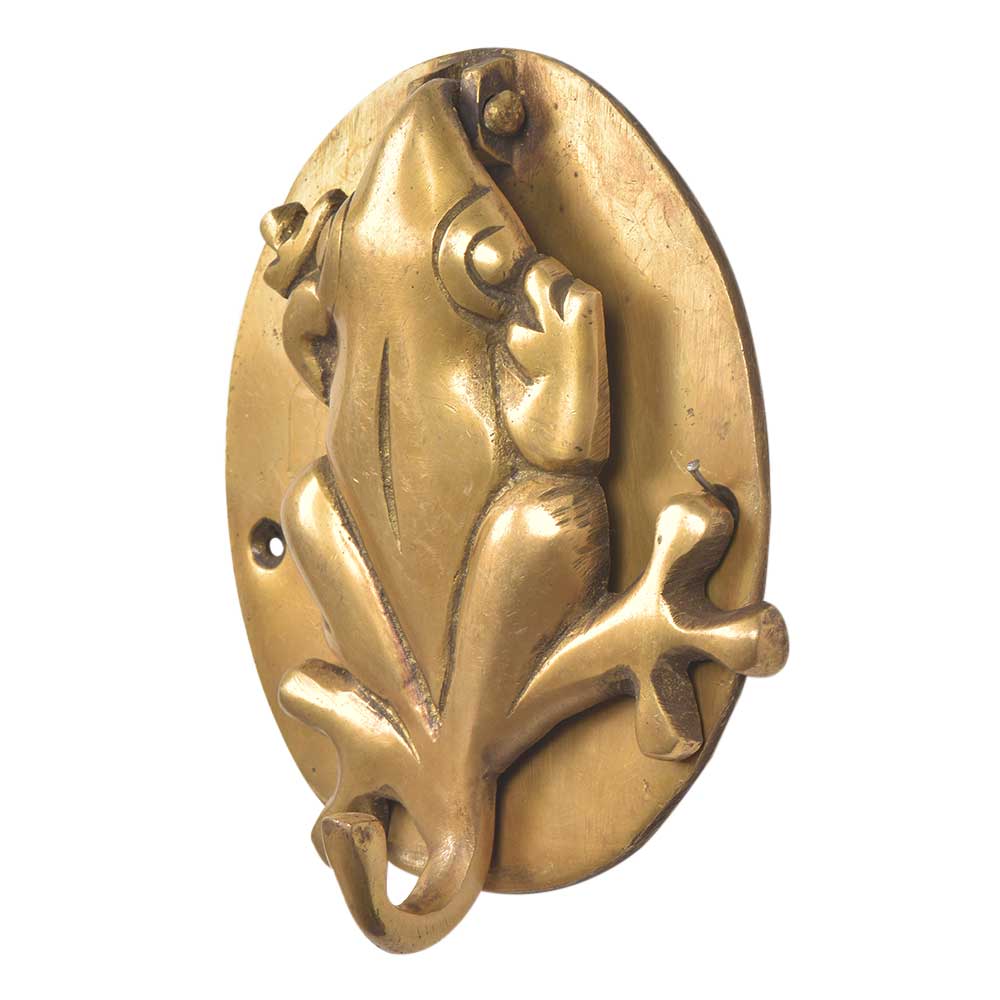 Very Interesting handmade Frog door knocker made of high quality brass by expert artisans and craftsmen of india. This frog door knocker bring a forest feel to the interiors since it has a broad strike plate it gives a loud knocking sound when the knocker is banged on the plate .
