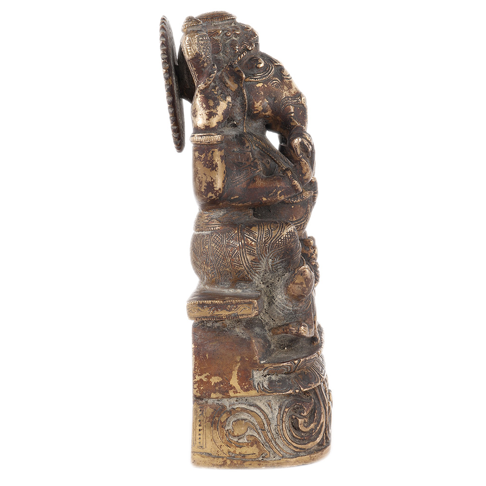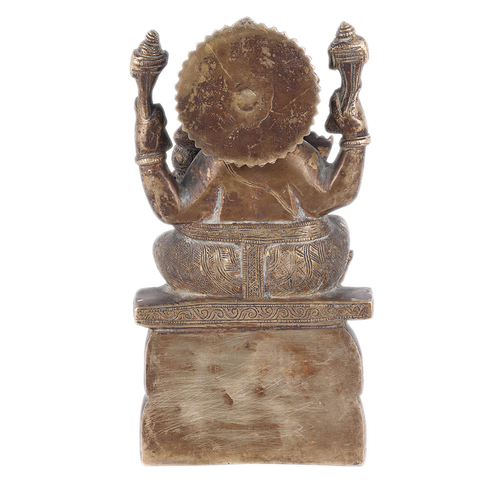 This Lord Ganesha statue is constructed in the traditional manner and is a reverent idol to use for your sacrifices. Ideal for a home mandir or workplace. The trunk on the left side, touching modak and moosak, is thought to be particularly lucky.