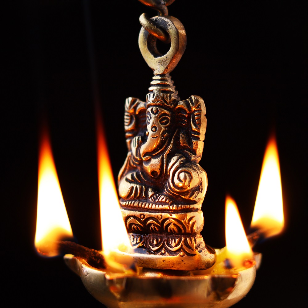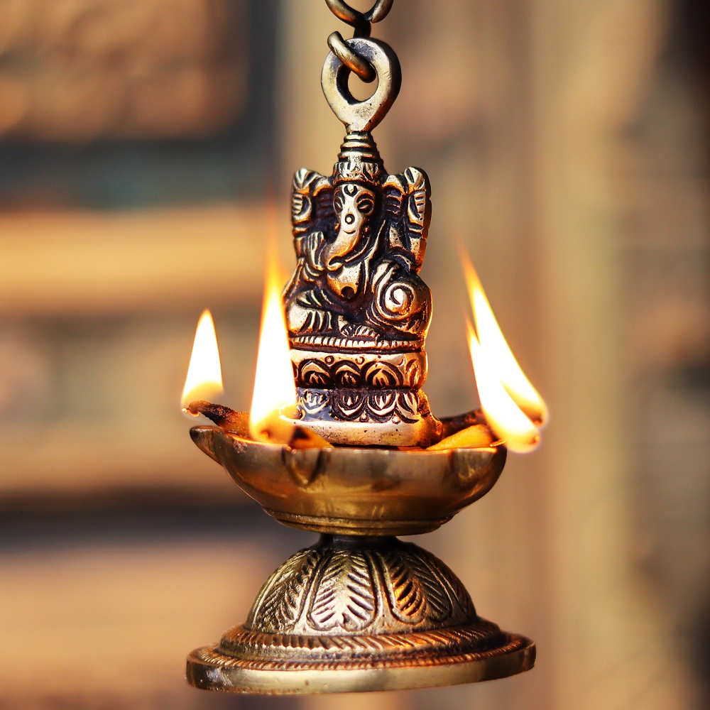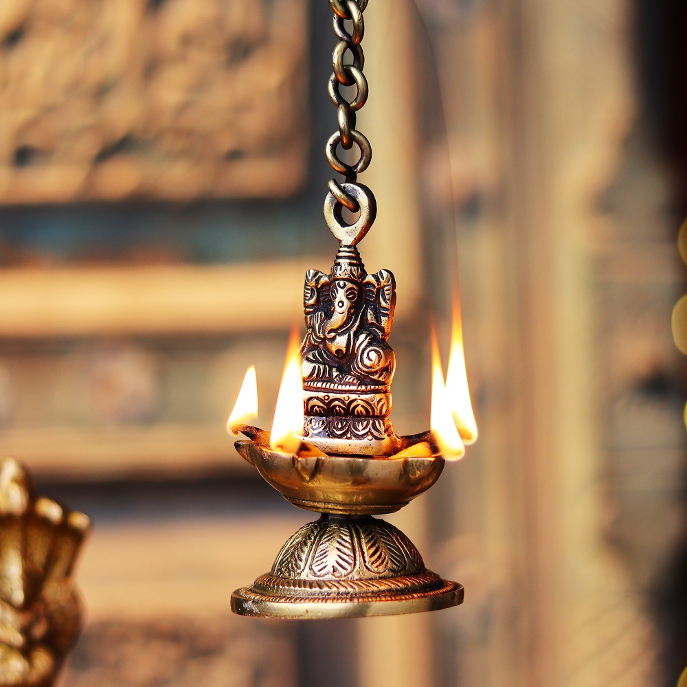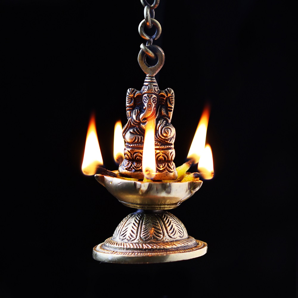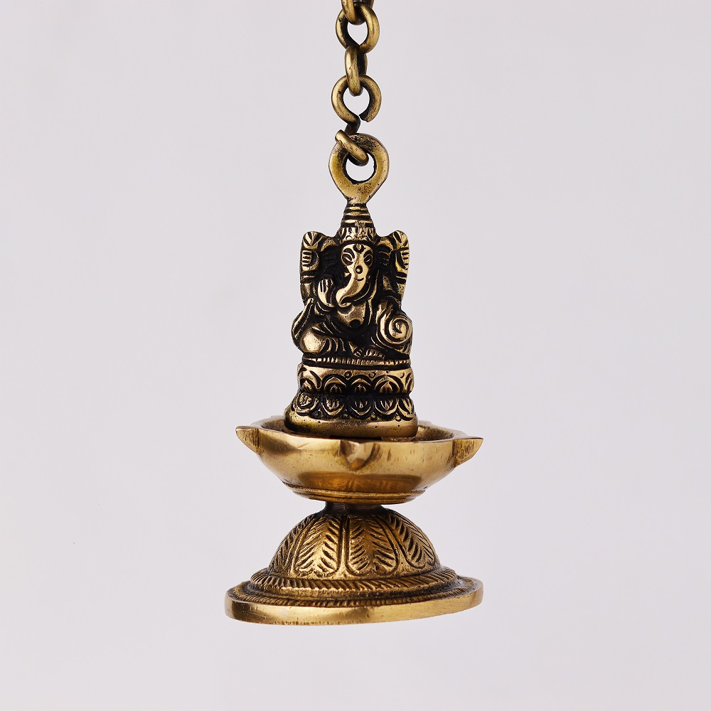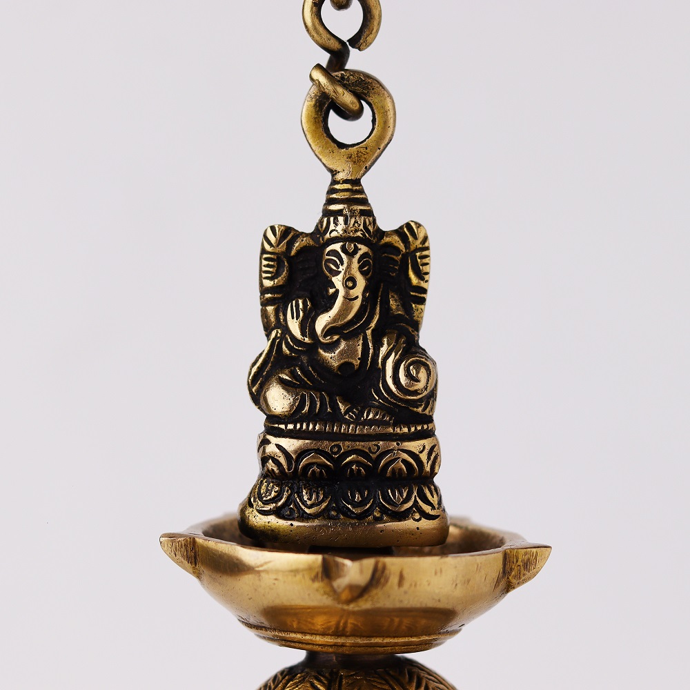 Brass Ganesha Figurine Hanging Four Wick Diya With Thick Chain can be Used Outside as well as in the interiors of your House as Well . These Diyas will Leave All Your Guests Mesmerized and Maintain a Spiritual Aura .The bell is excellent for personal use or for gifting purpose. in Your House.