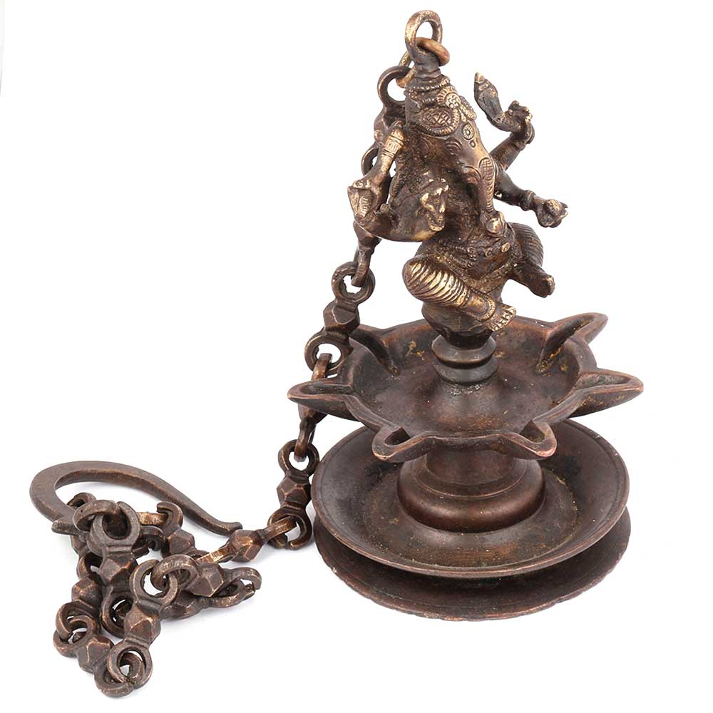 Brass Ganesha Hanging oil lamp alsp known as hookkuvilakku which literally translates to hanging lamps are still widely used in households and temples of the area as lighting. This would be lovely on an outside porch.