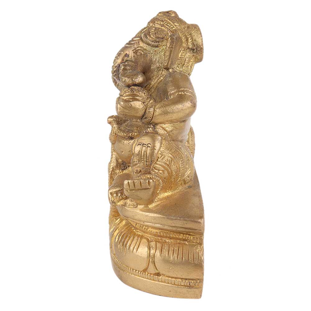 Handmade Bras Ganesha sitting next to a round pillow with a modak ( a sweet) in one hand on a round lotus base . Lord Ganesha is known as the remover of obstacle and god of wisdom. Diwali gift, new year gift, marriage gift, temple worship, stage decoration and house warming gift.