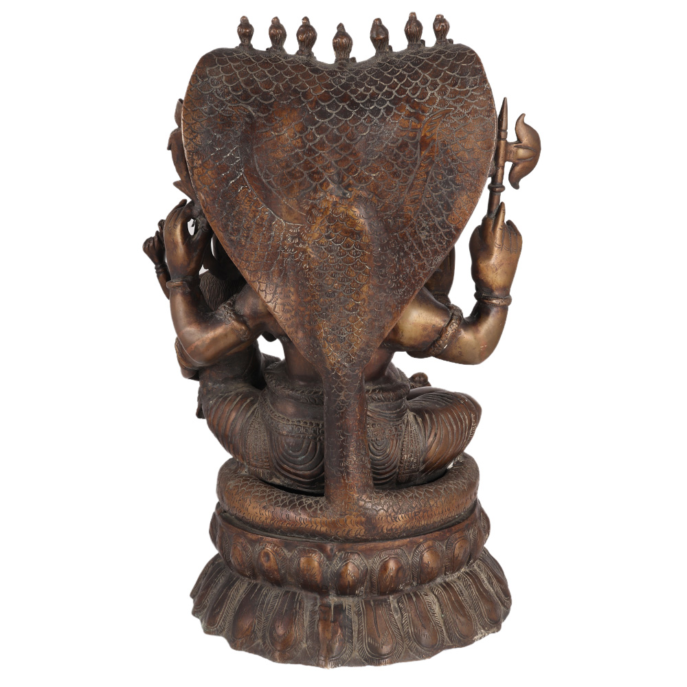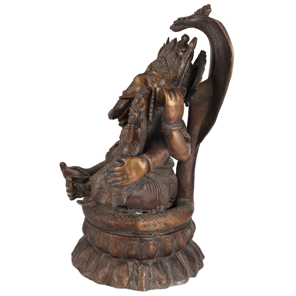 Brass Ganesh sits on the seven headed serpent Sheshnag, his right hand raised in the abhaya mudra of heavenly protection, his left arm wrapped around Lakshmi. Ganesh is known as the "remover of hurdles," and he is often called before new starts in one's life to help ease the way through any challenges. It has a dark finish.