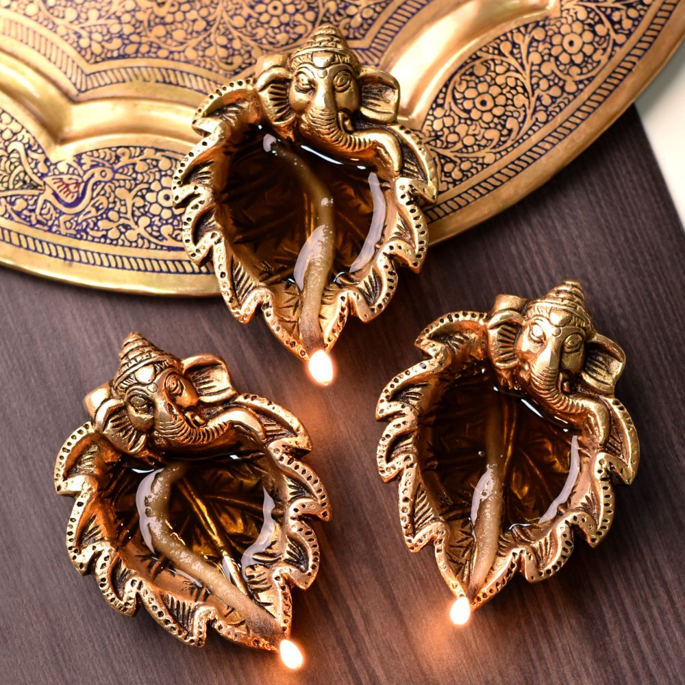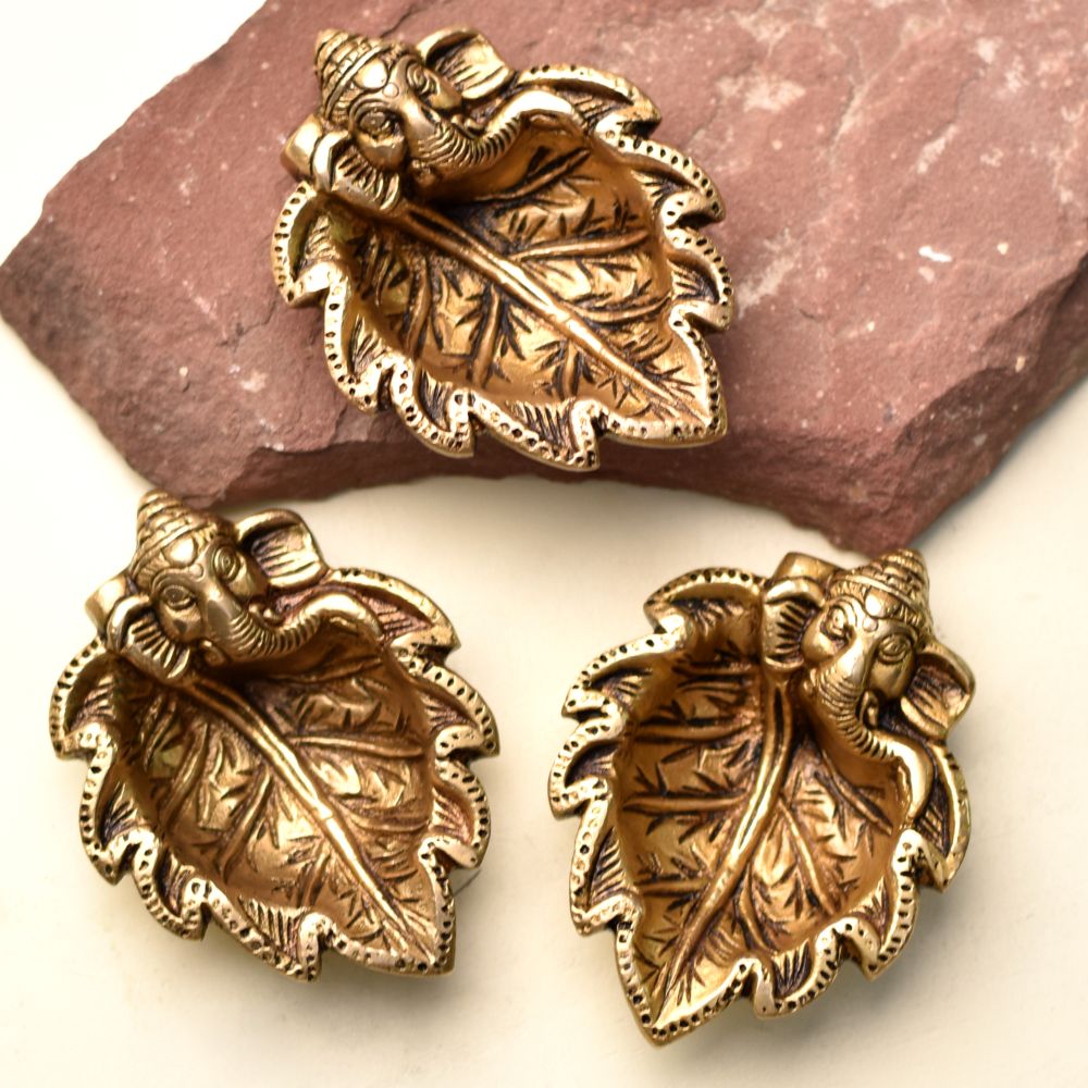 Celebrate the divine presence of Lord Ganesha with this Brass Ganpati on Leaf Ritual Diya. Designed with Ganesha seated gracefully on a carved leaf, this diya blends symbolic spirituality with artistic brass craftsmanship. Its golden shine adds a festive aura, making it perfect for Diwali puja, temple rituals, and auspicious gifting.