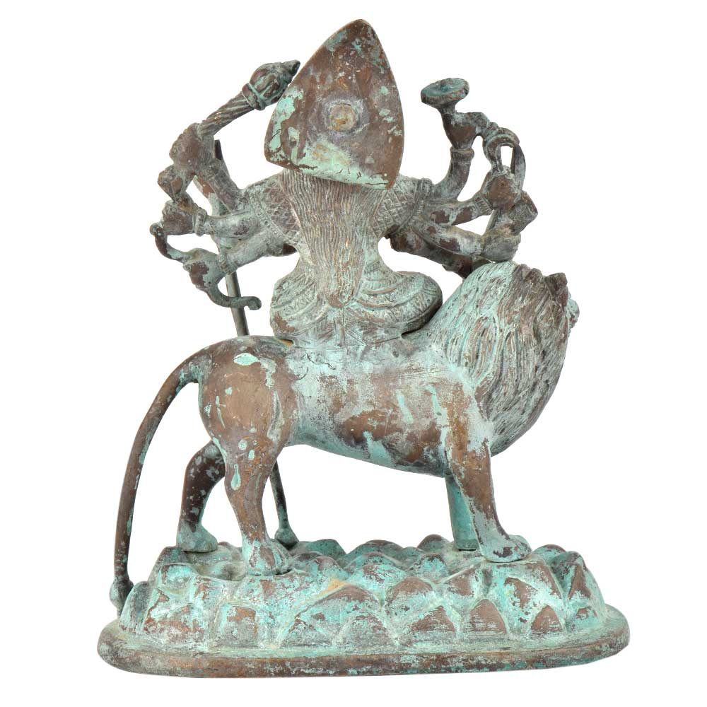 Durga Is a Popular Fierce Form of The Hindu Goddess Or Devi. She is Depicted with Multiple (Variously, From Ten Up to Thousand) Arms, Carrying Various Weapons and Riding a Ferocious Lion. She is Often Pictured as Battling or Slaying Demons, Particularly Mahishasura, the Buffalo Demon. Install this statue at home or office to draw inner strength and also to enhance your home decor .This statue comes with green patina finish.