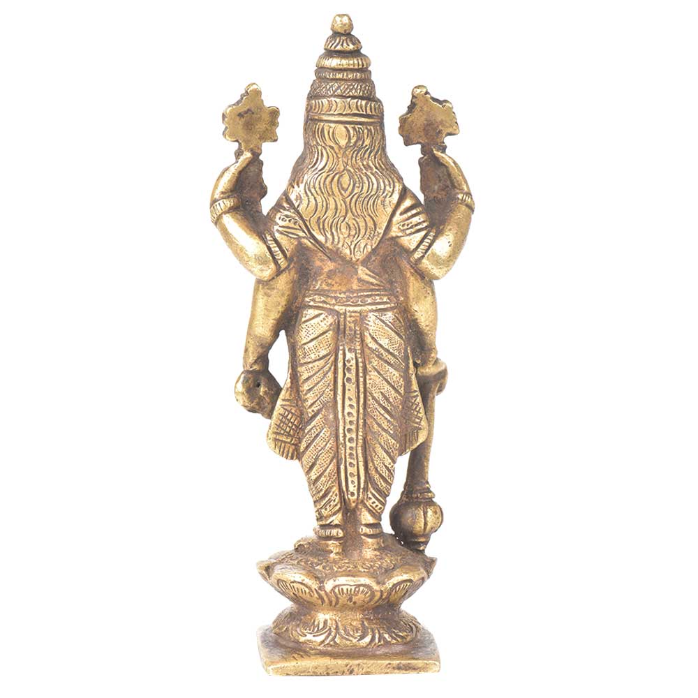 Goddess Laxmi standing on lotus is made of brass by the skilled craftsmen of India. Goddess laxmi is holding lotus in both her hands and in the other hand she is holding a gadha. This beautiful and finely engraved figurine can be used for gifting, decoration or for worshipping.