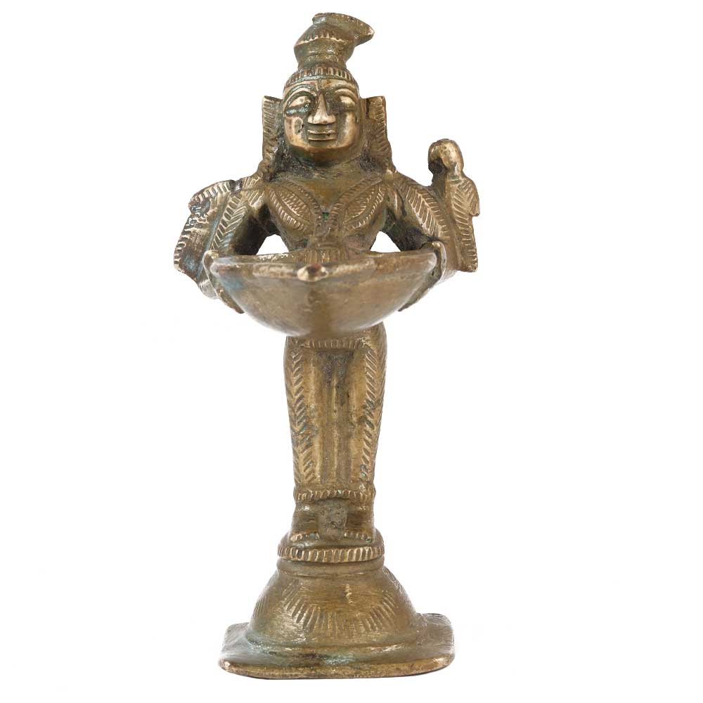 A beautifully crafted brass statue of Lakshmi, the deity of riches, prosperity holding an oil lamp in her hands and a parrot on her right shoulder. Although this sort of diya is commonly linked with Lakshmi, the parrot on her shoulder may indicate that the figure is Meenakshi, the deity of the picturesque Temple Complex in Madurai, Tamil Nadu, Southern India. The hairstyle, worn in a long high ponytail at the back, appears to prove this.