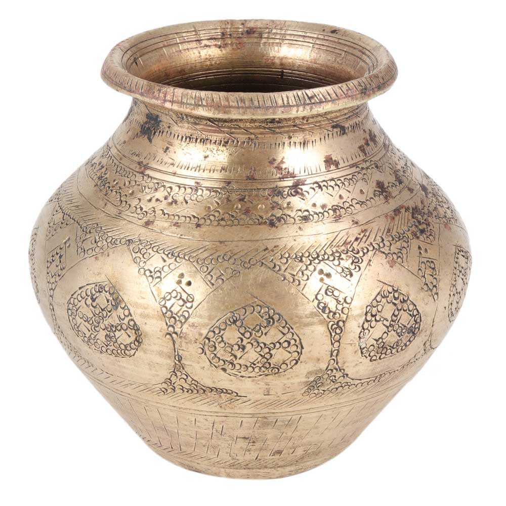 • Brass Golden Pooja Lota Kalash Swastik Hand Engraved Design