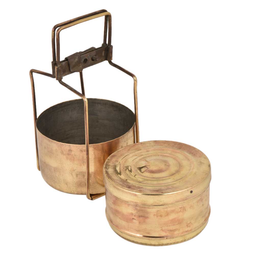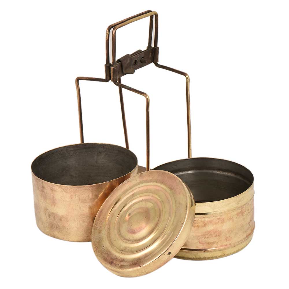 This is a traditional two tier brass Tiffin box made in traditional style where the two containers are quite spacious and comes in a lovely golden color. It has a traditional locking system that holds the Tiffin together. Use it as a showpiece or as a gift for near and dear ones on important functions and occasions.