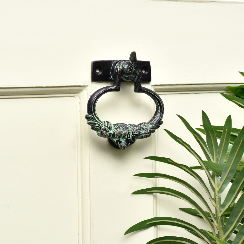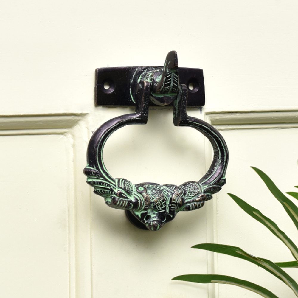 A very detailed brass door knocker with the elephant head where the brass knocker is attached to the ears to the elephant with engraved peacock design. The knocker is made of very heavy brass metal by master craftsmen who are masters of their trade . It is a very traditional looking auspicious door knocker which is not only functional but looks gorgeous too.