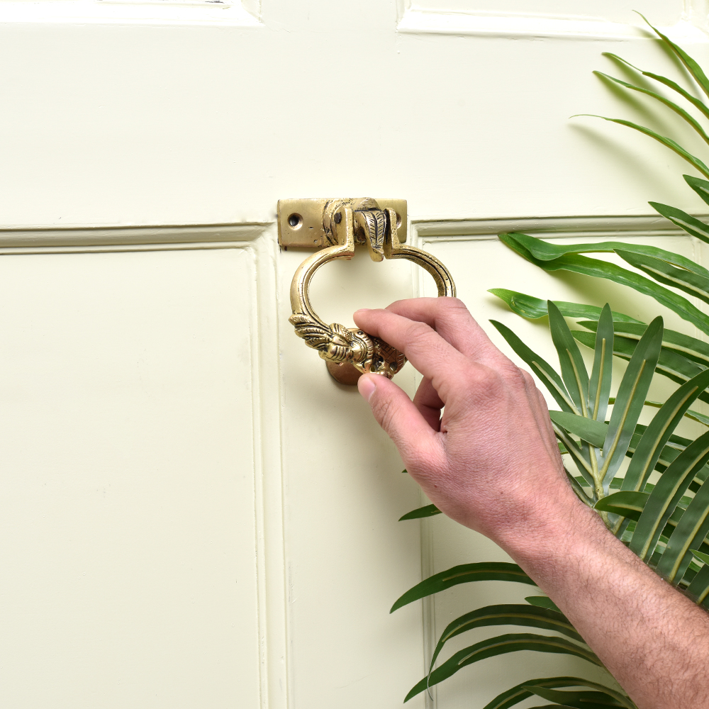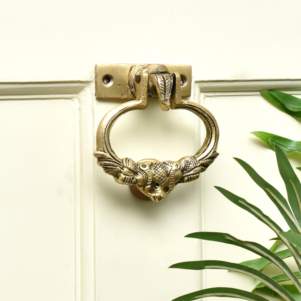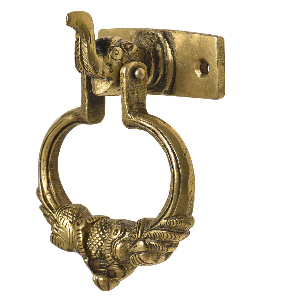 A very detailed brass door knocker with the elephant head where the brass knocker is attached to the ears to the elephant with engraved peacock design. The knocker is made of very heavy brass metal by master craftsmen who are masters of their trade . It is a very traditional looking auspicious door knocker which is not only functional but looks gorgeous too
