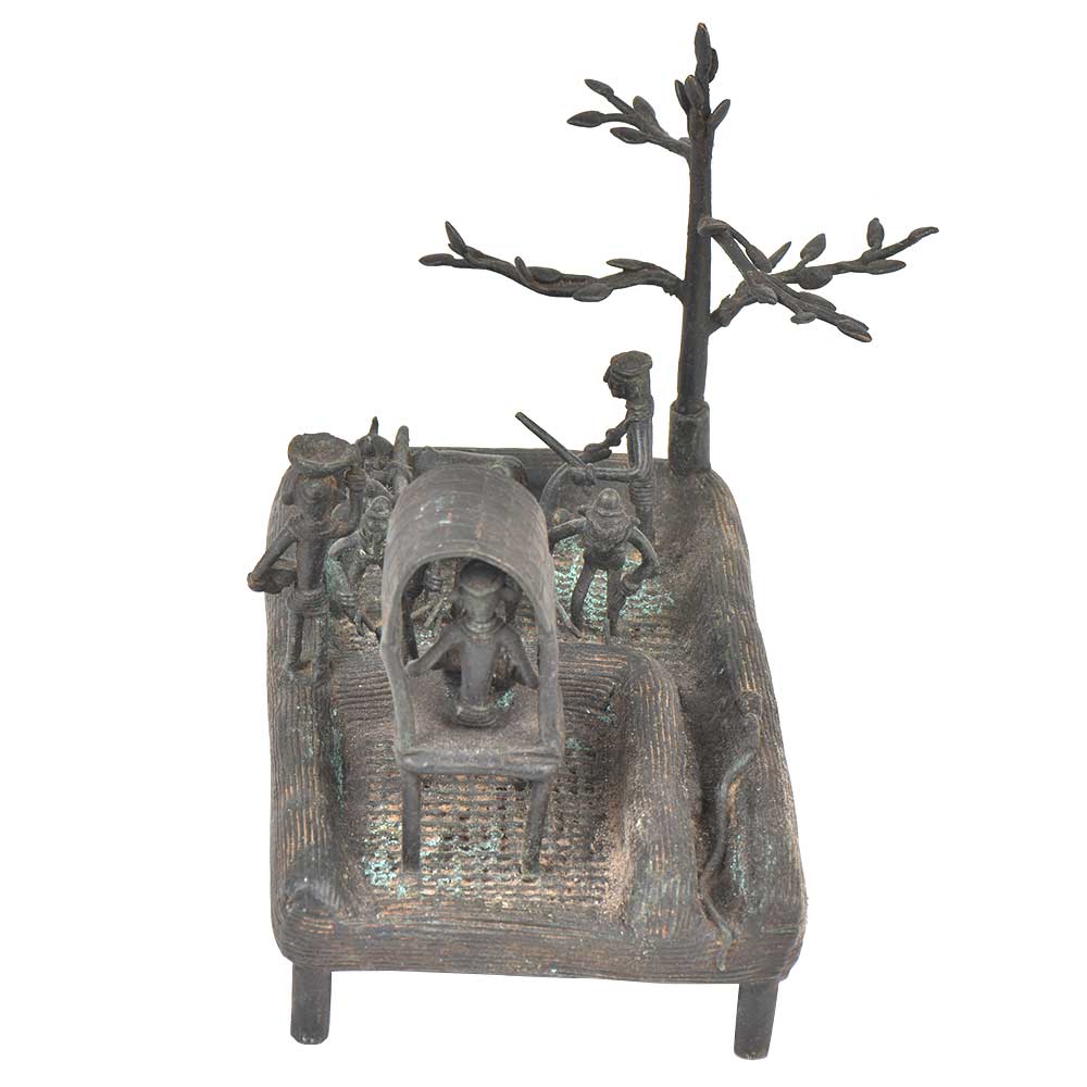 Handmade tribal showpiece made by the tribal artisans. The showpiece is made of fox brass and shows a pond where the tribal men are ploughing the field which is a typical village scene .On the other side is a tribal farmer holdiing basket and on the extreme corner there is a small hut where is a tribal seated playing the dholak . An excellent collectors item for the display unit.