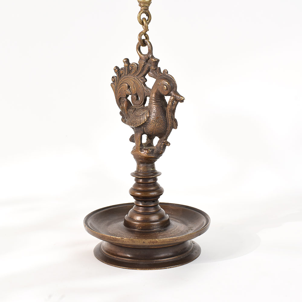 This is an intricately carved Annapakshi sculpture diya on a brass hanging villaku oil lamp. The lamp is typically found at the front door of most houses and serves as a welcome sign for all visitors. It's thought to live in heaven. The bird is typically shown holding a flowering vine in its beak, which represents abundance. During holidays and all puja / prayer ceremonies, it is important to light the diya or lamp to bring light, prosperity, and happiness to the entire family.