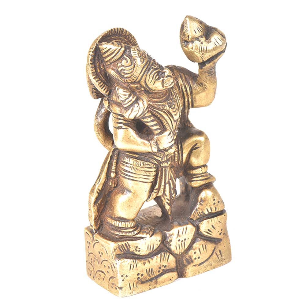 Statue of lord hanuman is made of brass by the skilled craftsmen of India. Lord hanuman is carrying the dronagiri mountain with his hand one hand and the other hand is holding the gadha.
