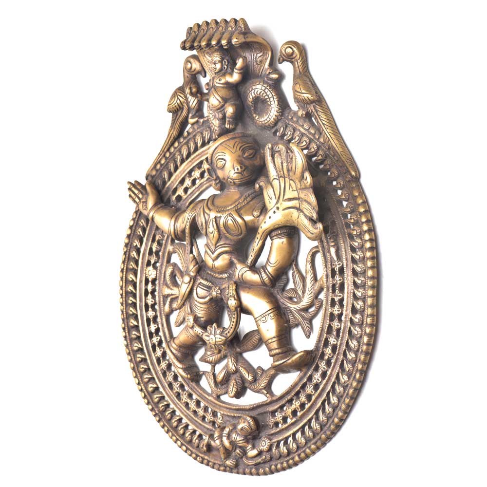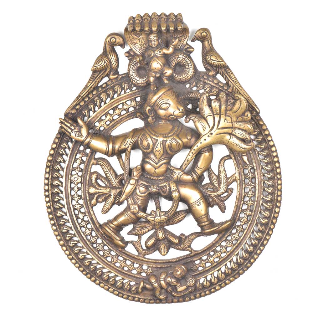 Handmade Spiritual Hindu Diety God Idol (Sculpture) of Rakshak Lord Hanuman Frame beautifully Handcrafted in shinning Brass which is very ideal for Wall Hanging. Lord hanuman is the protector and the destroyer of evil. The statue can be hanged in the living room to bring positive vibes in the house . The beauty of this wall hanging is its beautifully engraved border and the presence of sheshnag on the top of the frame.