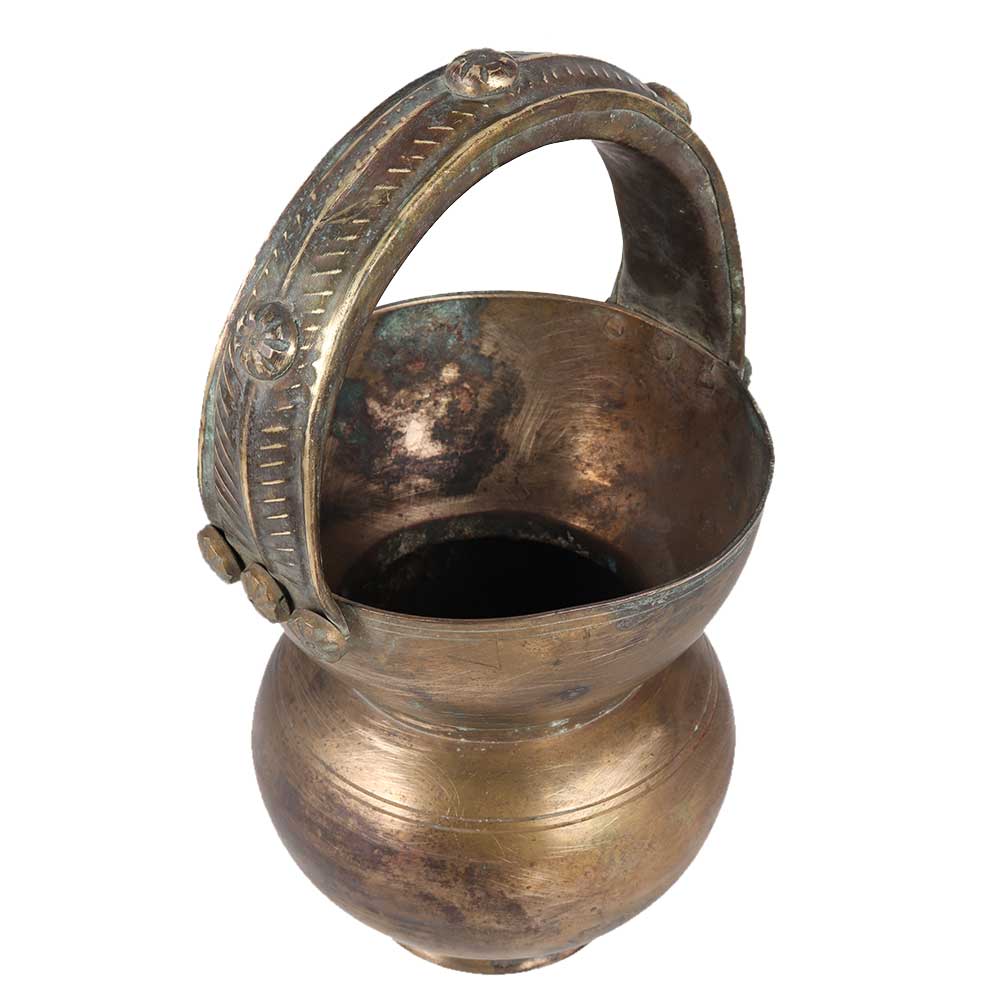 This brass pot is a traditional feature in Indian temples and is also used by priests and holy men to store Gangajal (holy water). The rich patina paint on the pot adds to the brass pot's distinctive rustic appellate court. The pot has a unique shape with a spout and dark finish.