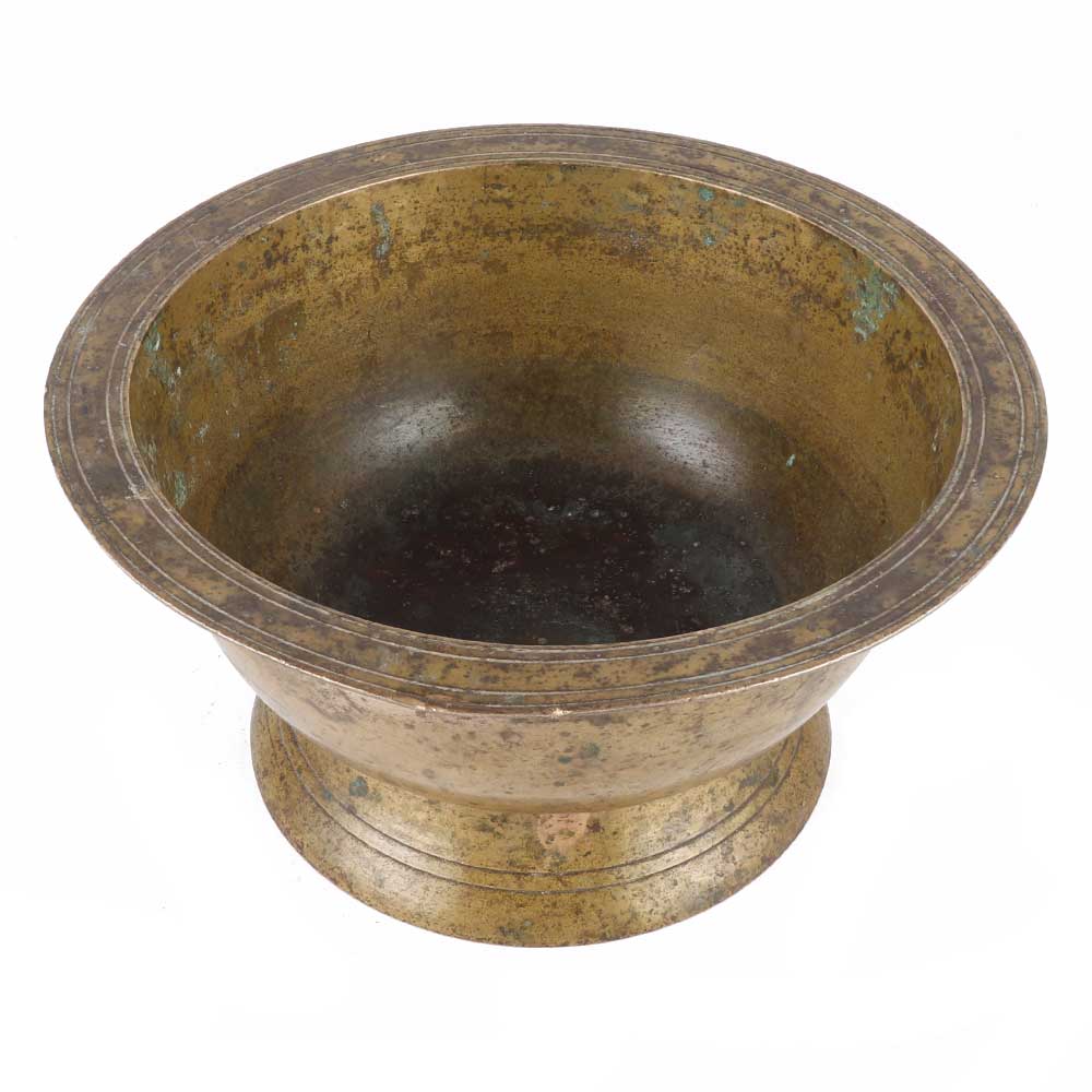 This antique style brass bowl has a protruding thick brass rim with a deep hollow and two ring handles. It can be used as a decorative as well as a centerpiece.
