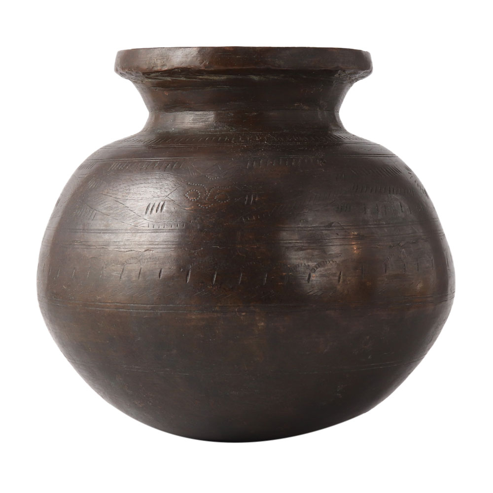 An old Indian brass pot from the 19th century with a protruding neck, a broad lip, and a huge belly. This metal water pot, which was created in India during the 19th century, catches our attention with its wide lines and attractively corroded, worn patina. The pitcher would look excellent displayed on a patio, in the yard, or on a strong table in any home. It features a wide belly that is topped with a flaring neck and protruding lip. This small Indian pot would bring exquisite appeal to your living room, dining area, or kitchen. It is frequently used in home temples or hindu temples. These things would be beneficial additions to your choice.