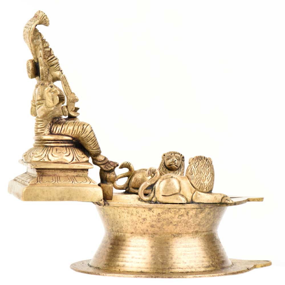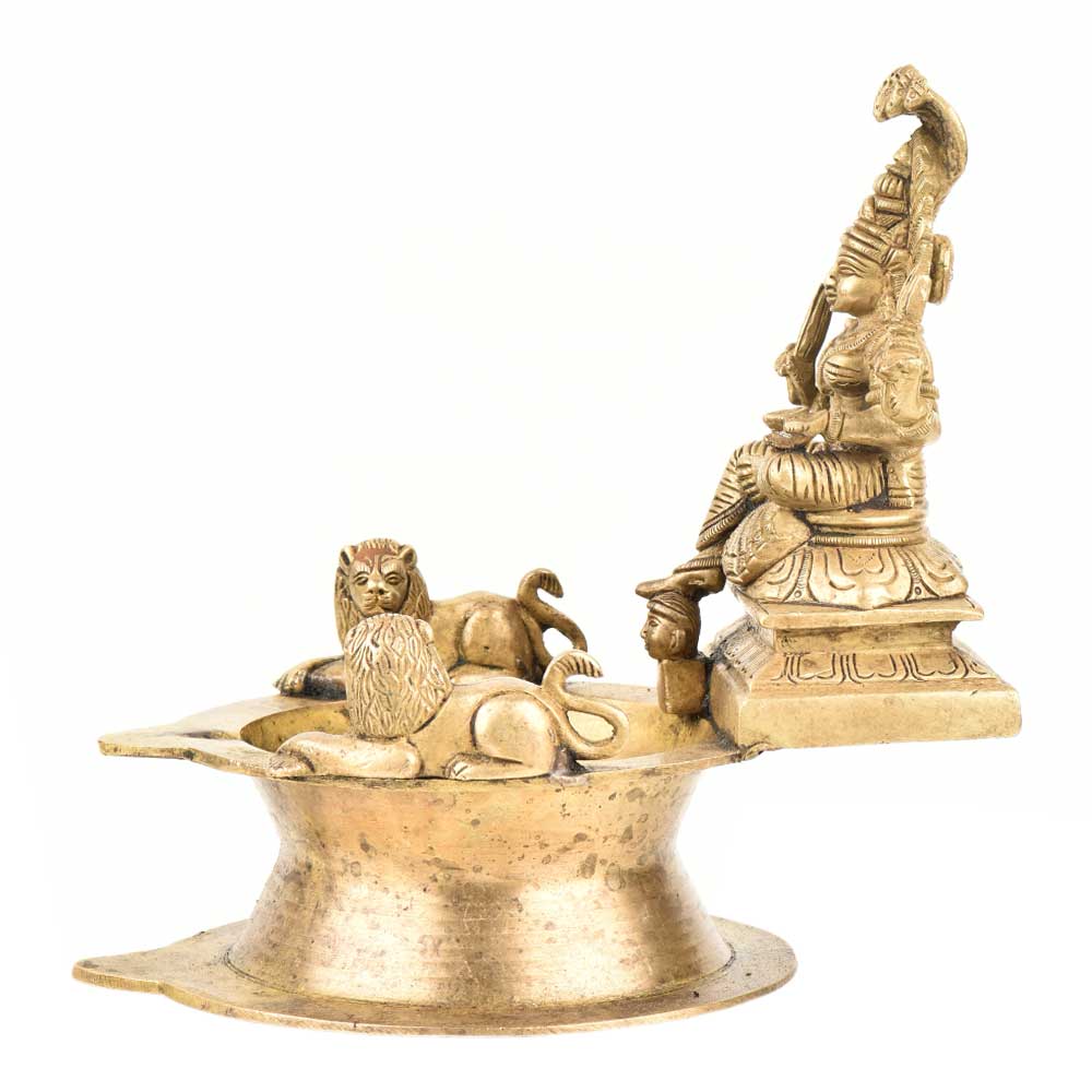 Handmade Brass oil lamp with goddess Mariammam with sheshnag and two lions is a very traditional lamp that adds spiritual flavour to your decor. Vegetable Oil, Mustard Oil or Desi Ghee can be Use to Light the Lamp with Cotton Wicks.