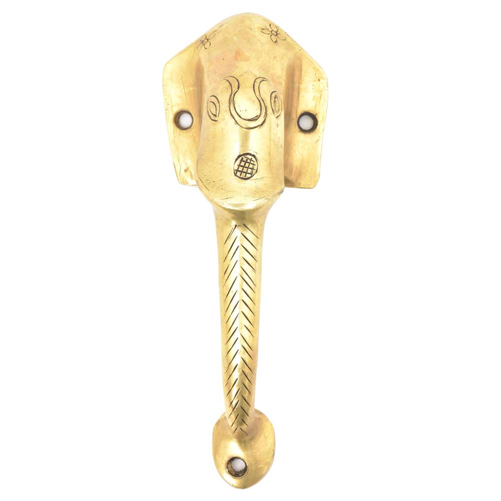Beautiful handmade elephant handle is made of brass by the skilled craftsmen of India. This handle is irregular shape and it has lines engraved on the trunk. It can be used for almirah, wardrobe, doors, cabinet etc