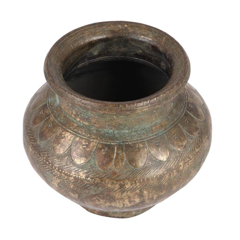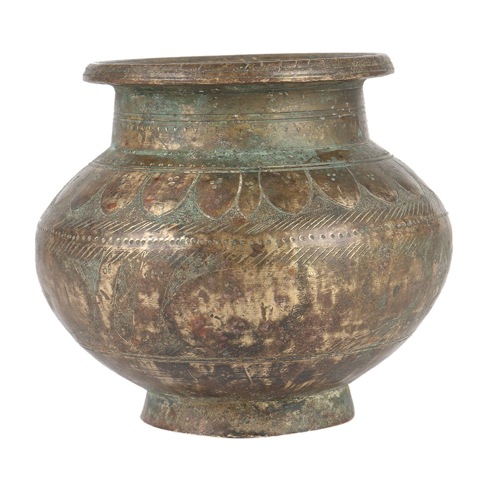 Indian Lota or vase constructed of brass and decorated with etched figures and a flowery pattern. This ancient vase has beautiful hand engraved craftsmanship. This Lota Ceremonial Water Vase Pots were originally carried by Hindus for religious rites and ablution.