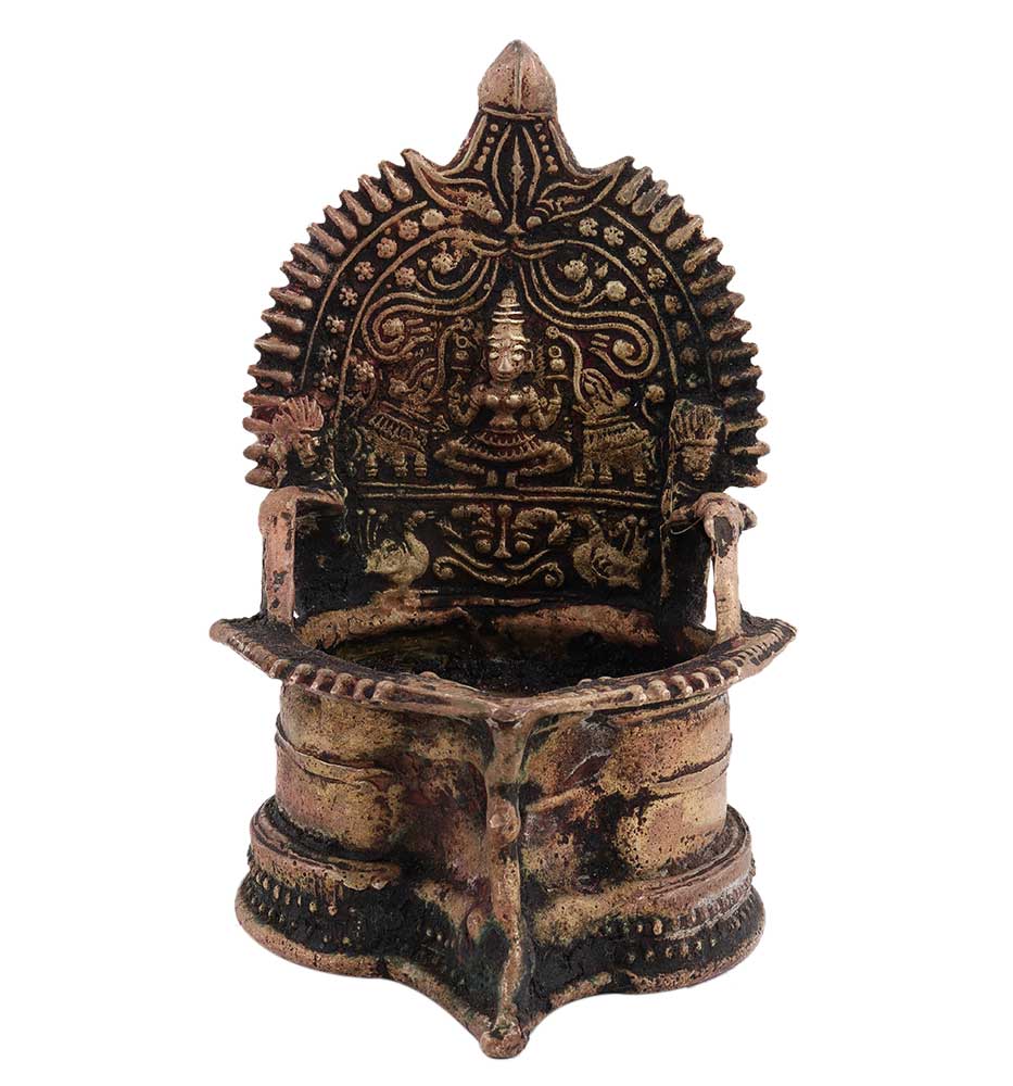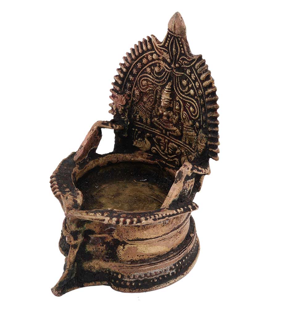 Brass Kamakshi Oil Worship Lamp used for illuminating your interiors on Diwali, weddings, inauguration ceremonies etc. Adds spiritual flavor to your decor. Vegetable oil, mustard oil or desi ghee can be used to light the lamp with cotton wicks.