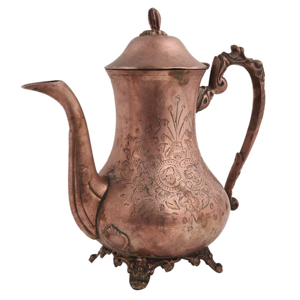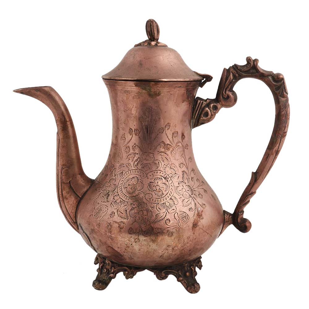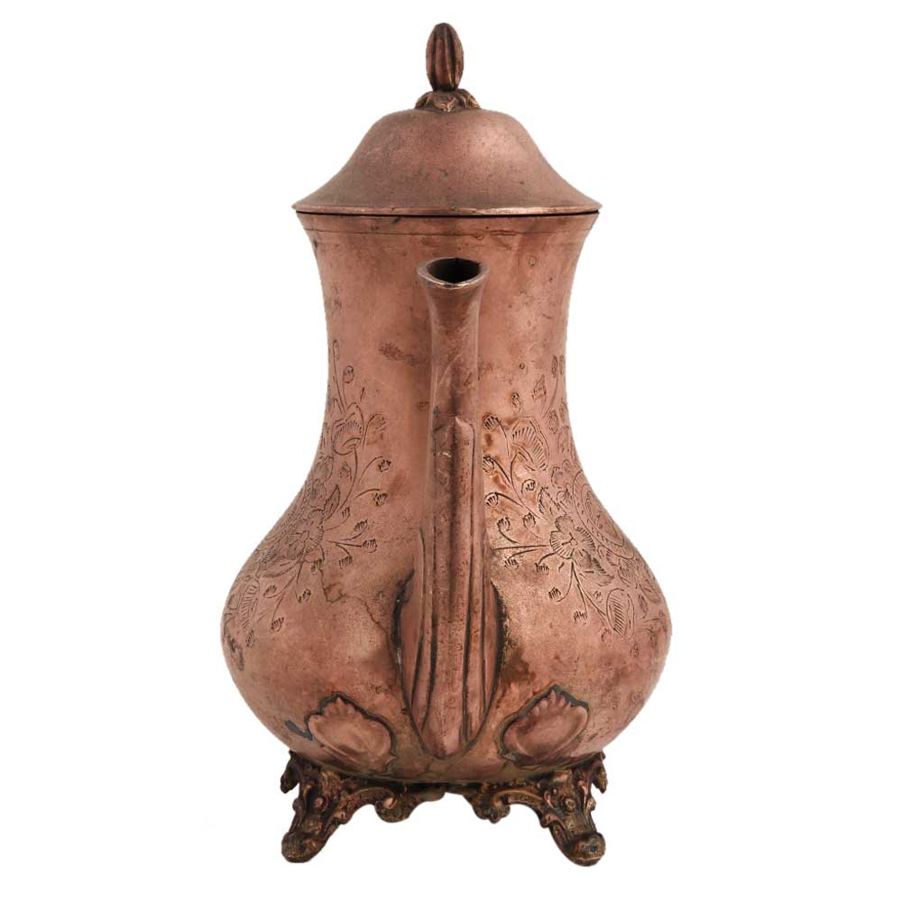 This brass kettle Tea Pot engraved leaf design and lid. It has decorative legs and lid. It is a masterpiece and deserves to be displayed in a glass cabinet , serveware, dinnerware ,Tableware, Wedding gift, Diwali gift for your near and dear ones.
